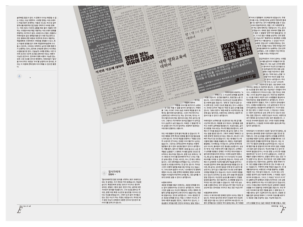 《마테리알》 4호는 타블로이드 판형의 흑백 신문형식을 띠고 있으며, 총 28면으로 구성되어 있습니다. 이번 4호의 특집은 2020년 8월부터 진행한 <공개서한> 프로젝트의 갈무리 성격을 띠고 있습니다. <공개서한> 프로젝트는 영화문화에 대해 열 세개의 질문을 던지면서 꽉 막혀 있는 영화문화에 활류를 일으키고자 한 프로젝트였습니다.