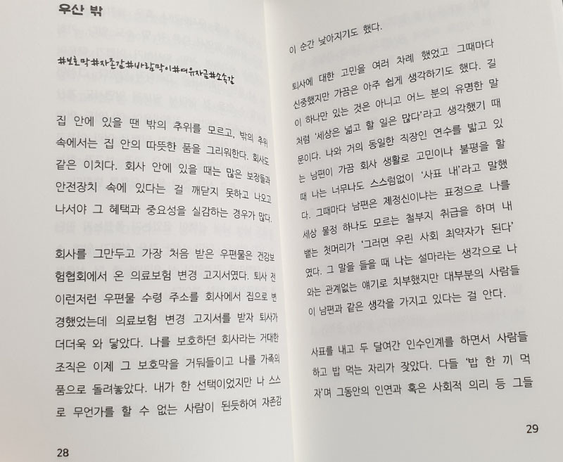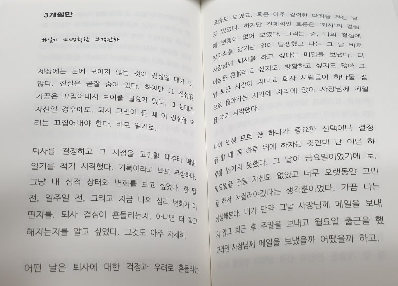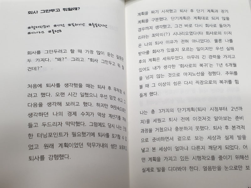 사회적으로 퇴사를 종용하는 분위기의 책들이 만연하다는 생각으로 저는 이 책을 조금은 무겁게 다루고 싶었습니다. 또한, 오랜 기간 고민과 준비로 퇴사를 하였으나 퇴사 전, 후로 놓친 것들에 대한 내용도 같이 실었습니다.