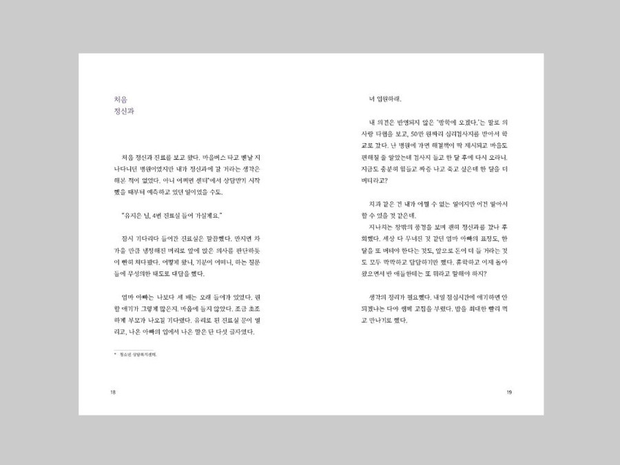 이 책은 제가 ‘나는 언제부터 병들어 가고 있던 걸까?’라는 질문을 던지는 데서 시작합니다. 처음 우울증에 걸리게 된 이유와 첫 번째~네 번째 입원, 그리고 그사이 이야기들을 통해 제가 1년을 어떻게 버티고 버텨 살아냈는지를 그리고 있습니다.