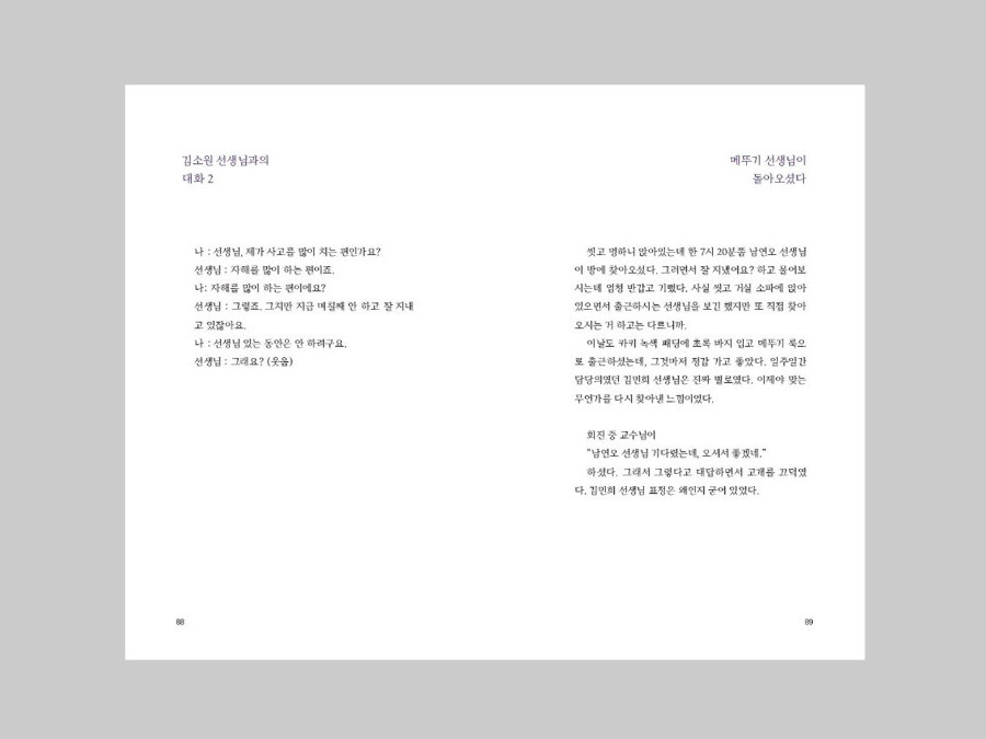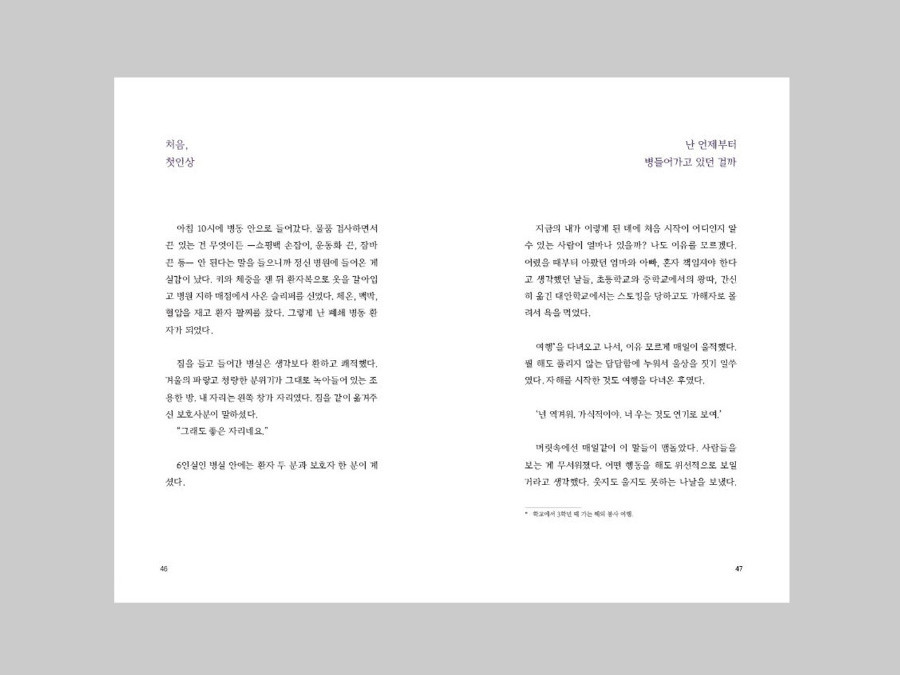 병동에서 지내면서 겪은 일, 한 생각들을 일기, 메모, 대화 등 다양한 형식의 글로 담았습니다.