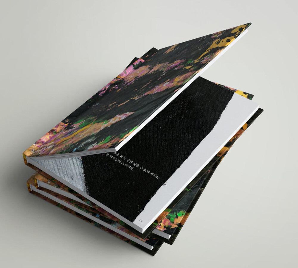 <창작을 위한 변명>은 200권 리미티드 에디션으로 제작되었습니다. 잠을 이루지 못했던 밤들, 작가가 이불 천 위에 붓질했던 작업을 책의 커버로 한 장 한 장 씌웠습니다. 때문에 <창작을 위한 변명>의 커버는 똑같은 것이 단 한 권도 없습니다. 뿐만 아니라 작가가 직접 정성껏 커버 바인딩 작업과 내지연결지, 가름끈을 색깔에 맞추어 핸드메이드 과정으로 제작하였습니다. 이 책은 커버가 작가의 작업으로 이루어진 진정한 의미의 아트북입니다.