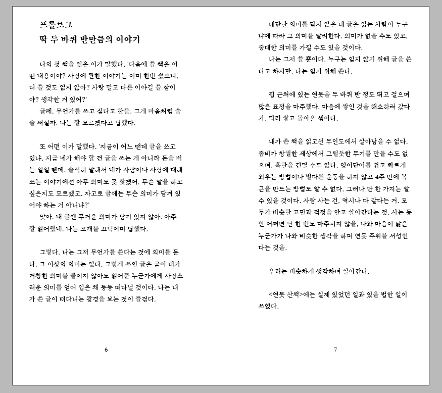 책을 모두 읽고 난 후에는 가벼운 산책을 다녀온 것같은 산뜻함 을 느끼실 수 있길 바랍니다.