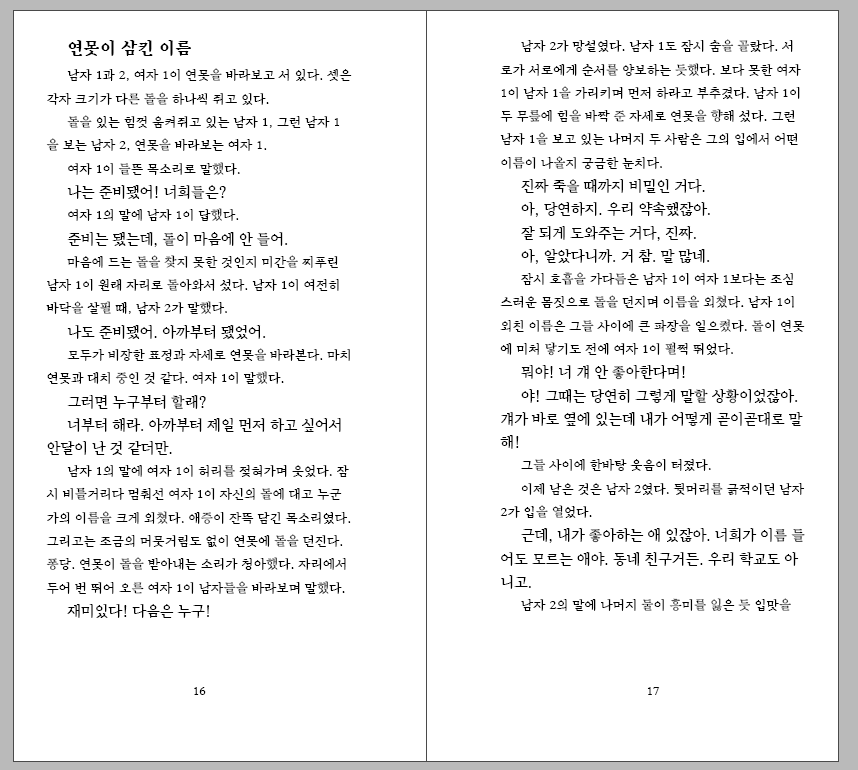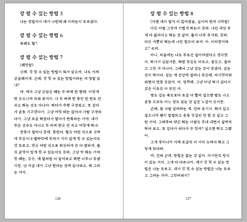오래전 받았던 편지나, 실제로 일어났으면 하는 소설같은 이야기, 걸음을 맞춰 따라오는 사색, 지나간 감정도 함께 보실 수 있습니다. 셋 혹은 그 이상의 챕터에서는 말 그대로 연못을 걷고 뛰는 셋 혹은 그 이상의 사람들에 관해 썼습니다.