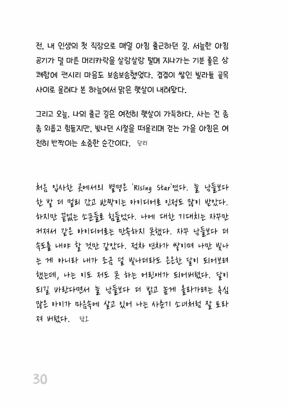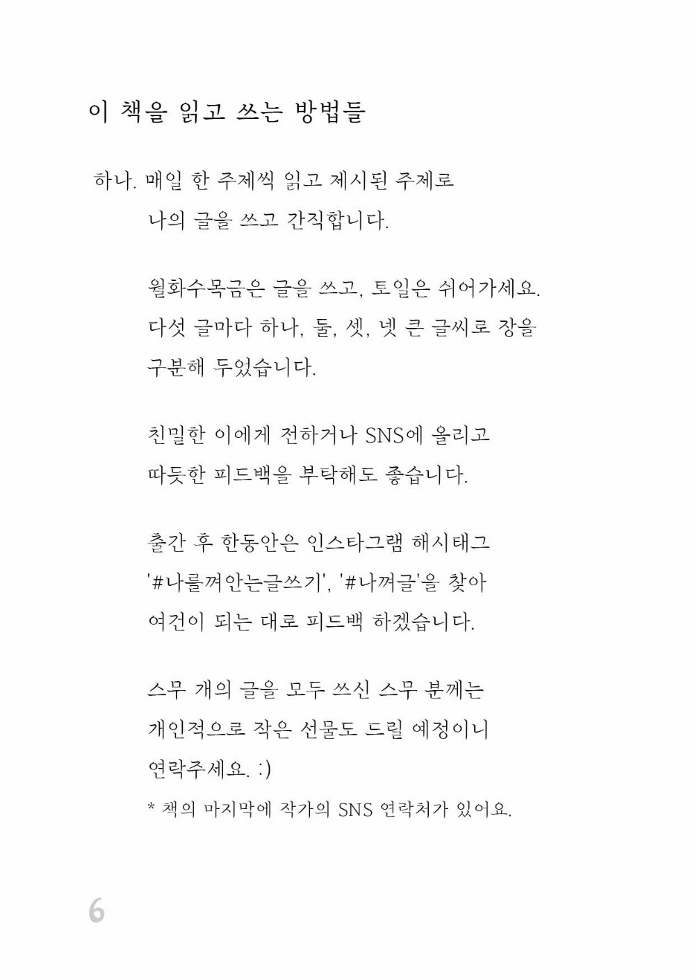 <나를 껴안는 글쓰기>는 같은 이름의 글쓰기 프로그램에서 출발했습니다. 자아 성장 플랫폼 밑미에서 만든 온라인 습관 프로그램의 하나였죠. 4주간 월요일부터 금요일까지 매일 하나의 글을 쓰고, 주말에는 다른 사람의 글을 읽으며 피드백을 달았습니다.