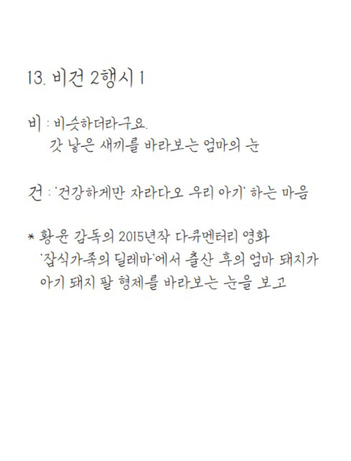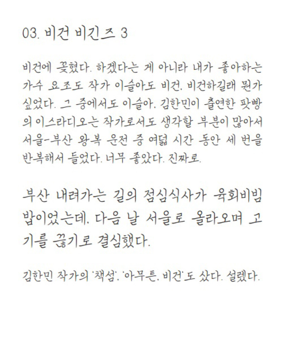 비건에 꽂혔다. 하겠다는 게 아니라 내가 좋아하는 가수 요조도 작가 이슬아도 비건, 비건하길래 뭔가 싶었다. 그 중에서도 이슬아, 김한민이 출연한 팟빵의 이스라디오는 작가로서도 생각할 부분이 많아서 서울-부산 왕복 운전 중 여덟 시간 동안 세 번을 반복해서 들었다. 너무 좋았다. 진짜로. 부산 내려가는 길의 점심식사가 육회비빔밥이었는데, 다음 날 서울로 올라오며 고기를 끊기로 결심했다. _‘비건 비긴즈 3’