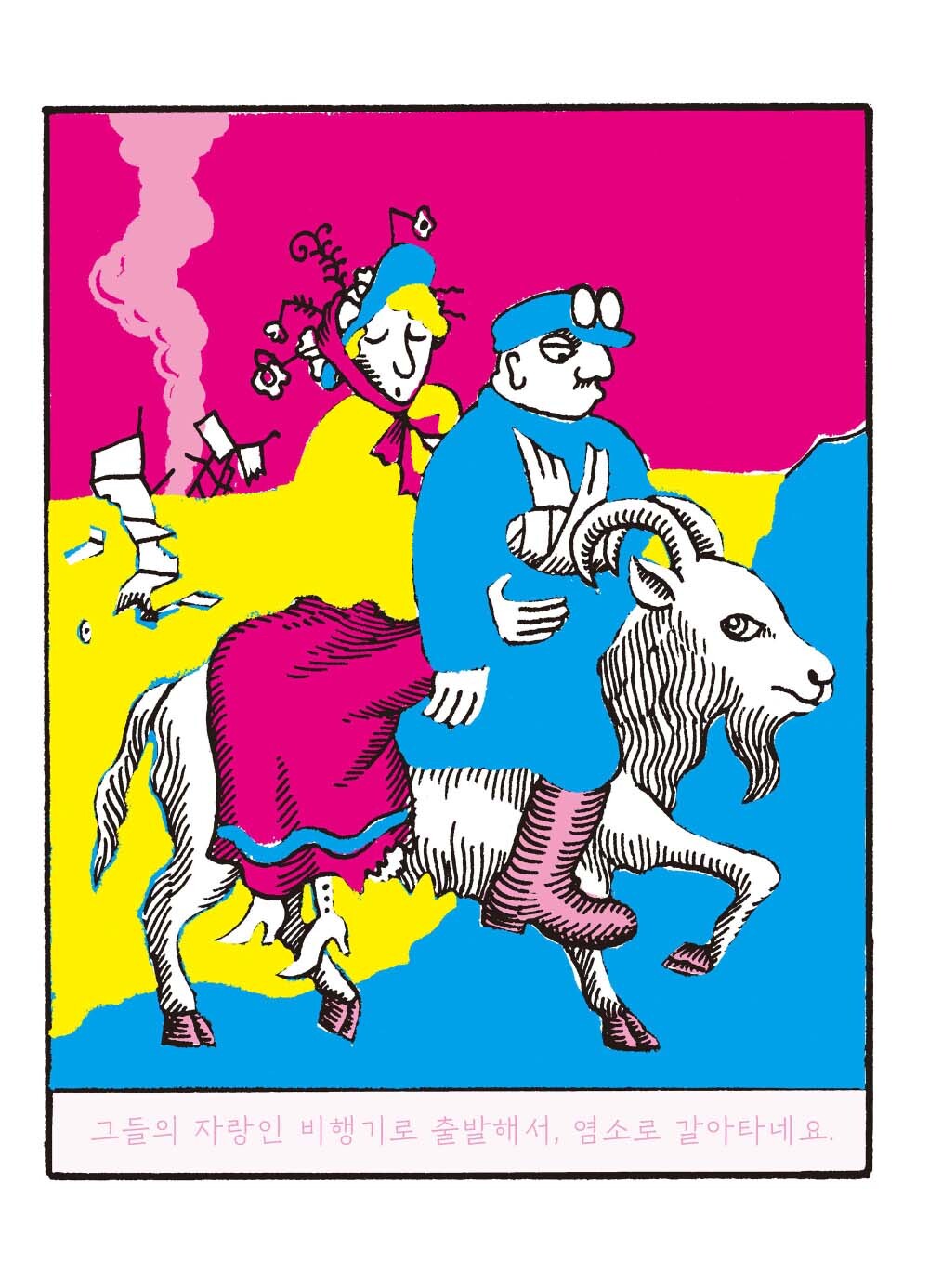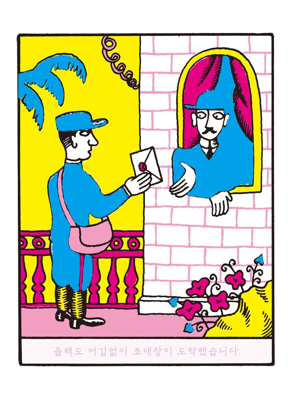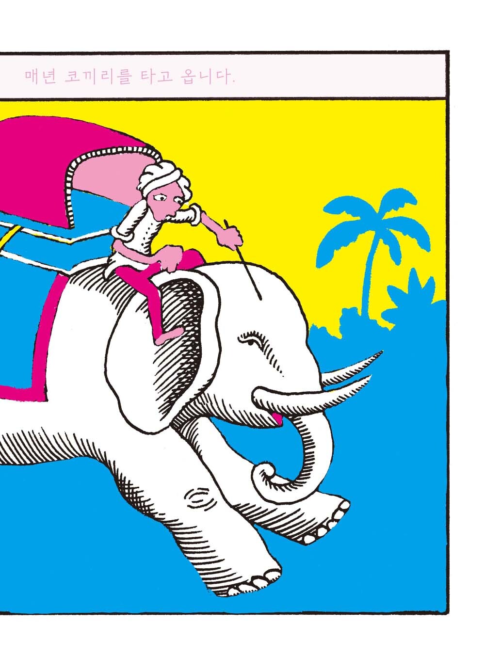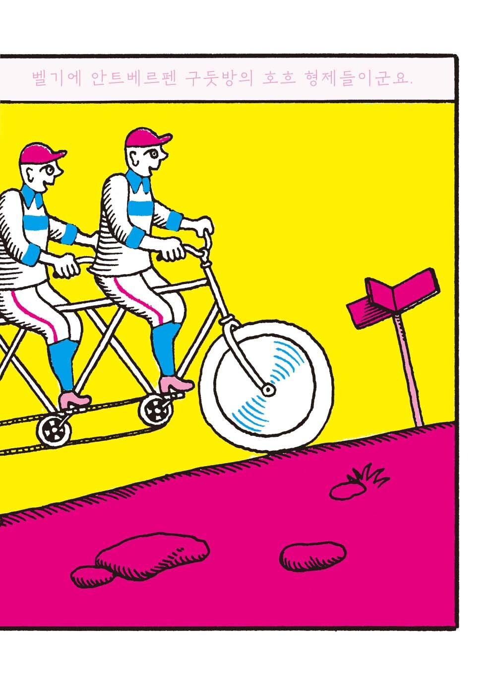같은 마음으로 향하는 그들이겠지만, 그들의 탈것은 형형색색 다채롭고 선명합니다. 라이푸르의 스밀라 씨는 매년 코끼리를 타고 오고, 낭트의 뒤부 부부는 그들의 자랑인 비행기로 출발해서 염소로 갈아타고 옵니다. 5인승 자전거로 언덕을 오르는 안트베르펜의 호흐 형제들, 독특한 디자인의 롤러스케이트를 신은 덴버의 재단사 미니까지!