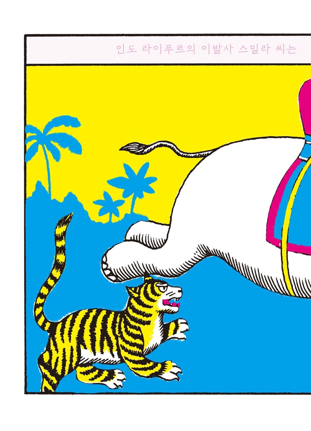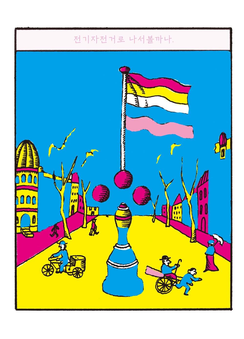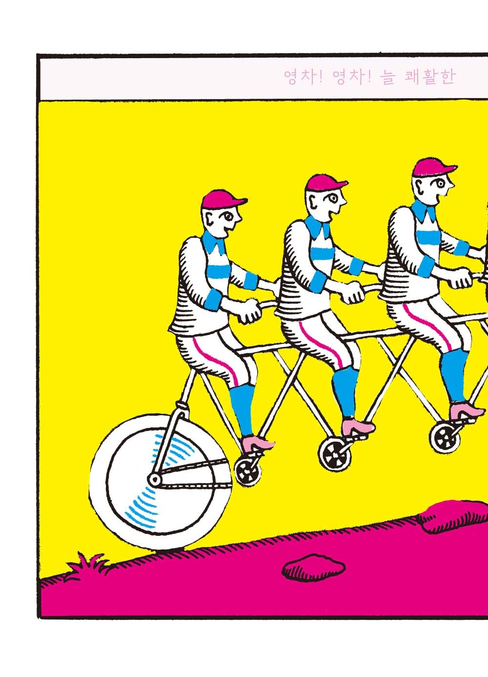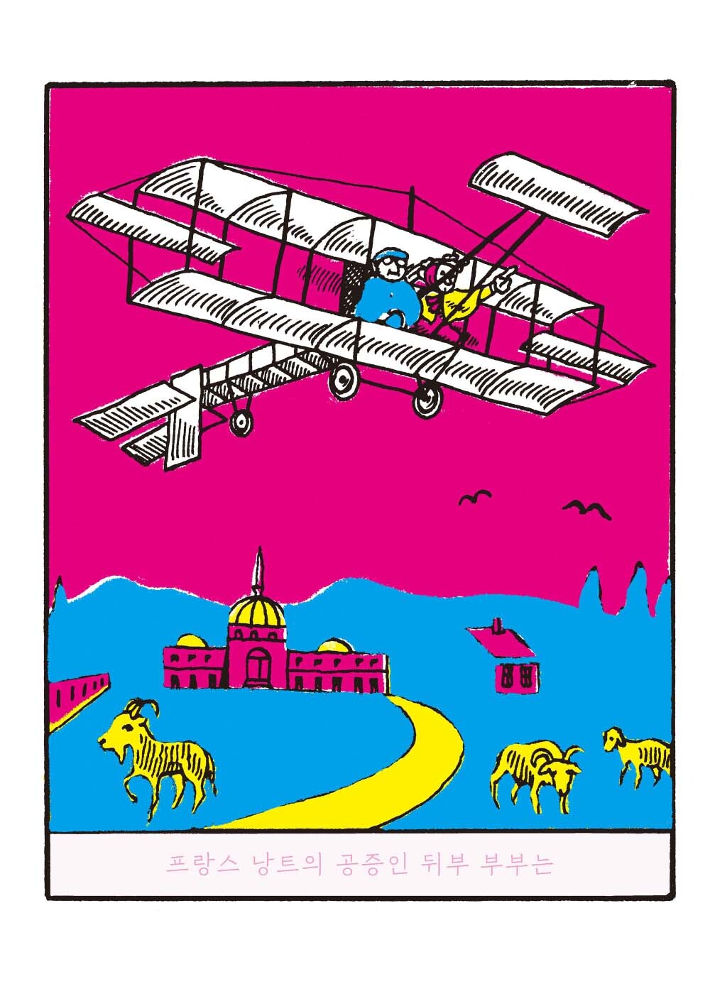 같은 마음으로 향하는 그들이겠지만, 그들의 탈것은 형형색색 다채롭고 선명합니다. 라이푸르의 스밀라 씨는 매년 코끼리를 타고 오고, 낭트의 뒤부 부부는 그들의 자랑인 비행기로 출발해서 염소로 갈아타고 옵니다. 5인승 자전거로 언덕을 오르는 안트베르펜의 호흐 형제들, 독특한 디자인의 롤러스케이트를 신은 덴버의 재단사 미니까지!
