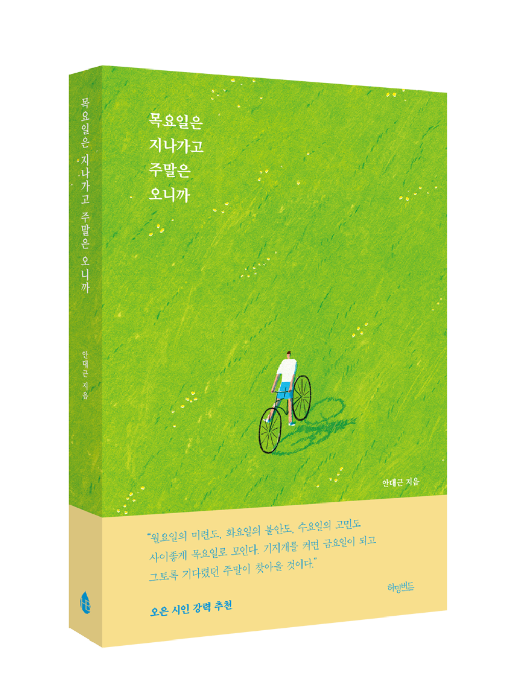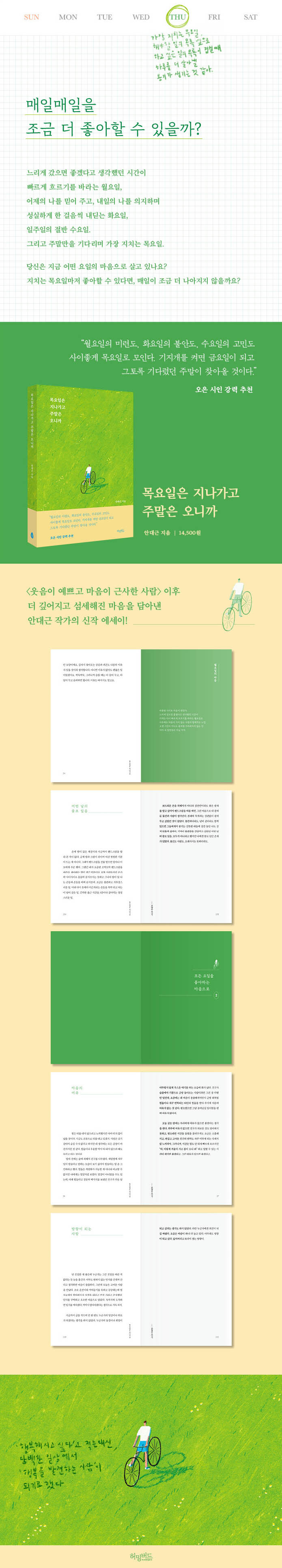 누군가의 성취가 나를 우울하게 할 때. 타인과의 경쟁에서 밀릴까 불안할 때. 나만 아무것도 이룬 게 없는 것 같아 초조할 때. 지치고 고단한 하루 속에서 스스로에 대한 확신 없이 자꾸만 작아져 본 사람에게 안대근은 말한다. 어쩌면 지금 이 시기는 기나긴 삶 안에서 그저 목요일일지도 모른다고. 매일이 지치는 목요일 같지만 주말은 늘 찾아오듯, 불안으로 그림자 진 지금도 결국은 환한 곳으로 향해 가는 과정이라는 메시지를 전한다.