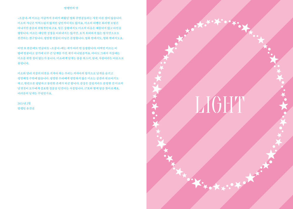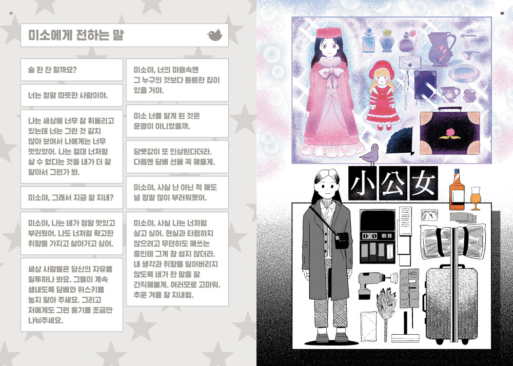 이번 호 본문에도 언급되듯《소공녀》에는 새가 여러 번 등장합니다. 어쩌면 미소는 이 땅에 발붙이고 살기에 너무 큰 날개를 가진 새가 아니었을까요. 아마도 그래서 지상에는 미소를 위한 집이 없는가 봅니다. 미소에게 날개는 종종 위스키, 담배, 사랑이라는 이름으로 불립니다.