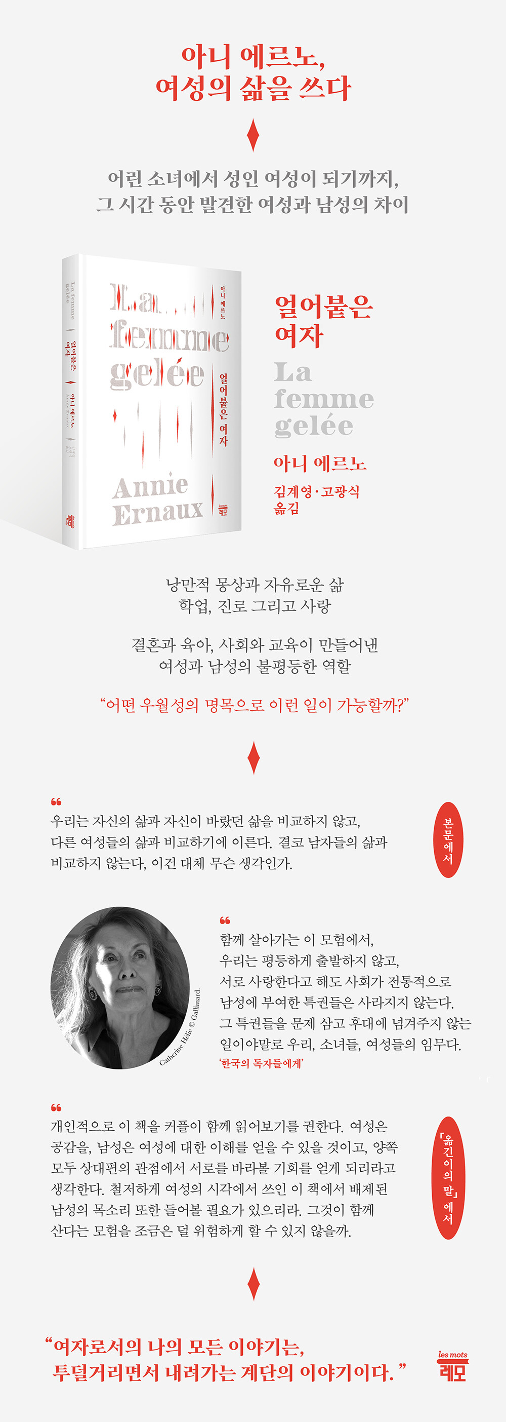 아니 에르노의 『얼어붙은 여자』는 어린 소녀가 성인 여성, ‘얼어붙은 여자’가 되기까지 한 여성의 삶을 그린 소설이다. 소녀에서 한 남자의 아내, 그리고 아이의 엄마가 되는 과정은 문화와 교육으로 만들어진 남성과 여성 사이에 존재하는 비합리적인 차이를 발견하고 확인하는 시간에 불과하다.