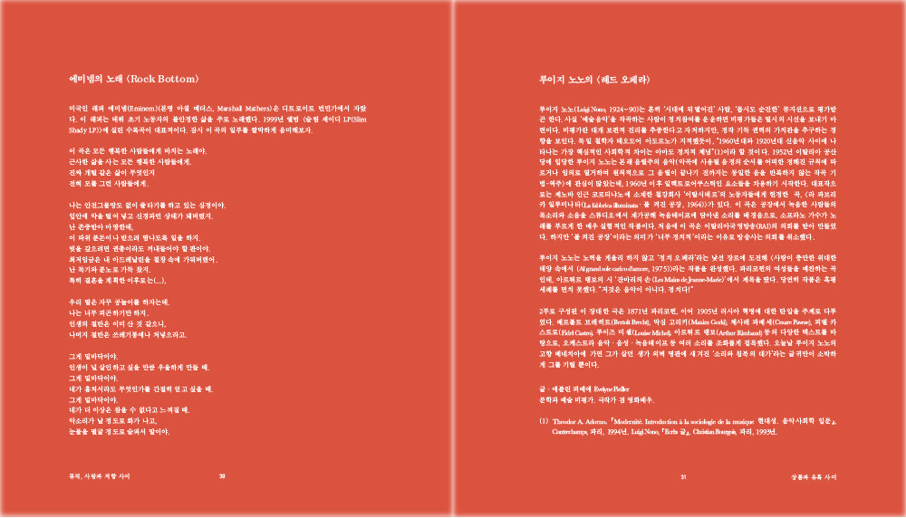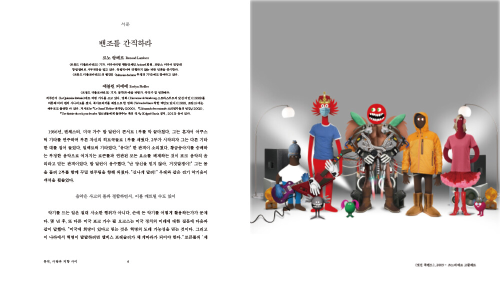 프랑스의 저명한 문예비평가인 에블린 피에예를 비롯한 22명의 국내외 필진은 로큰롤, 재즈, 팝, 포크부터 랩, 블루스, 레게, 클래식, 컨트리뮤직, 샹송, 살사, 헤비메탈, 테크노펑크 등에 이르기까지 음악가의 열정이 어떻게 역사 속에서 민중과 함께 하는 선율로 변환되었는지를 조명한다.