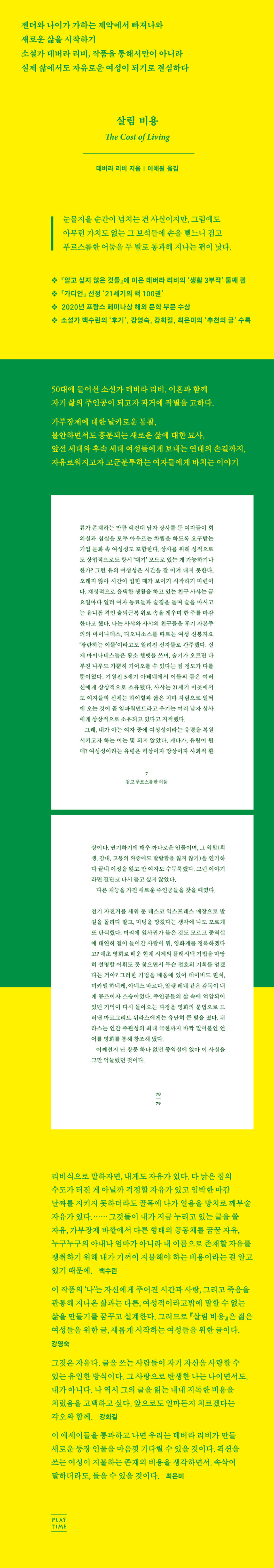 2013년 남아프리카공화국 출신 영국 소설가 데버라 리비는 자전적 에세이 『알고 싶지 않은 것들』을 발표했다. 처음 출간되었을 때 ‘조지 오웰의 「나는 왜 쓰는가」에 대한 하나의 응답’이라는 부제가 붙기도 한 이 책에서 리비는 밝히지 않은 상처를 안은 채로 여성 작가의 자아라는 문제를 성찰했다. 활발히 소설 집필을 이어 가던 와중 그는 이 자전적 에세이를 ‘생활 자서전’(living autobiography) 3부작으로 확장했고 2018년에 둘째 권인 『살림 비용』을 출간했다. 『살림 비용』은 출간 후 “회고록이자 페미니즘 선언”이라는 평가를 받으며 『가디언』이 뽑은 ‘21세기의 책 100권’ 중 하나로 이름을 올렸고, 2020년에는 『알고 싶지 않은 것들』과 함께 프랑스어로 번역되어 심사 위원이 전원 여성으로 구성되는 페미나상의 해외 문학 부문에서 수상하기도 했다. 그리고 전작 『알고 싶지 않은 것들』에 이어 이번에도 이예원 번역가의 작업으로 플레이타임에서 『살림 비용』 한국어판이 출간되었다.