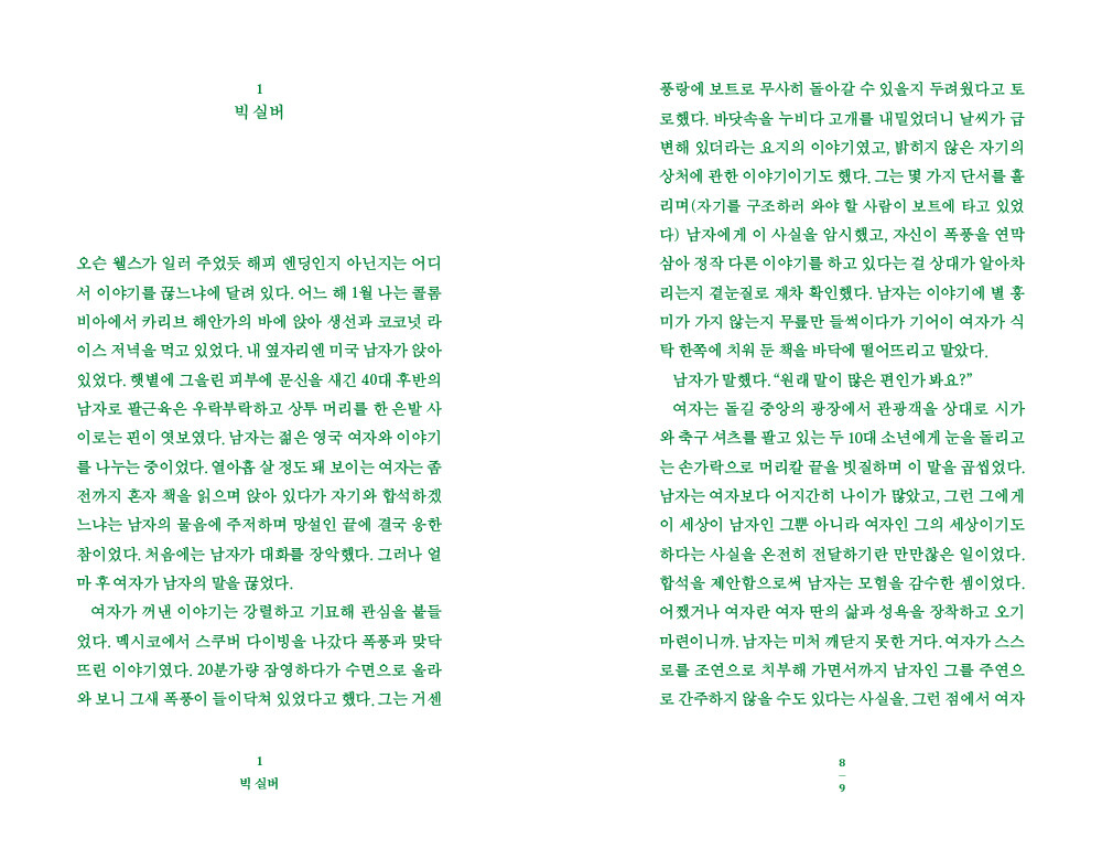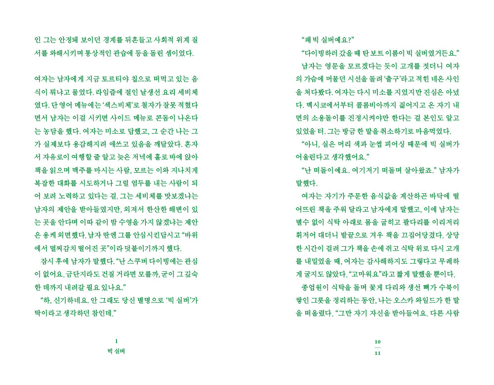 “그래, 내가 아는 여자 중에 여성성이라는 유령을 복원시키고자 하는 이는 몇 되지 않았다. 게다가, 유령이 뭔데? 여성성이라는 유령은 허상이자 망상이자 사회적 환상이다. 연기하기에 매우 까다로운 인물이며, 그 역할(희생, 감내, 고통의 와중에도 발랄함을 잃지 않기)을 연기하다 끝내 이성을 잃고 만 여자도 수두룩했다. 그런 이야기라면 결단코 다시 듣고 싶지 않았다.” (78~79쪽)