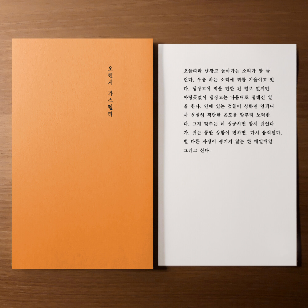 실망한 것은 아니었는데, 다만 오렌지 맛이 나지 않는 그 어중간한 오렌지 카스텔라 기분을 책에 담아두고 싶단 생각이 들었습니다.