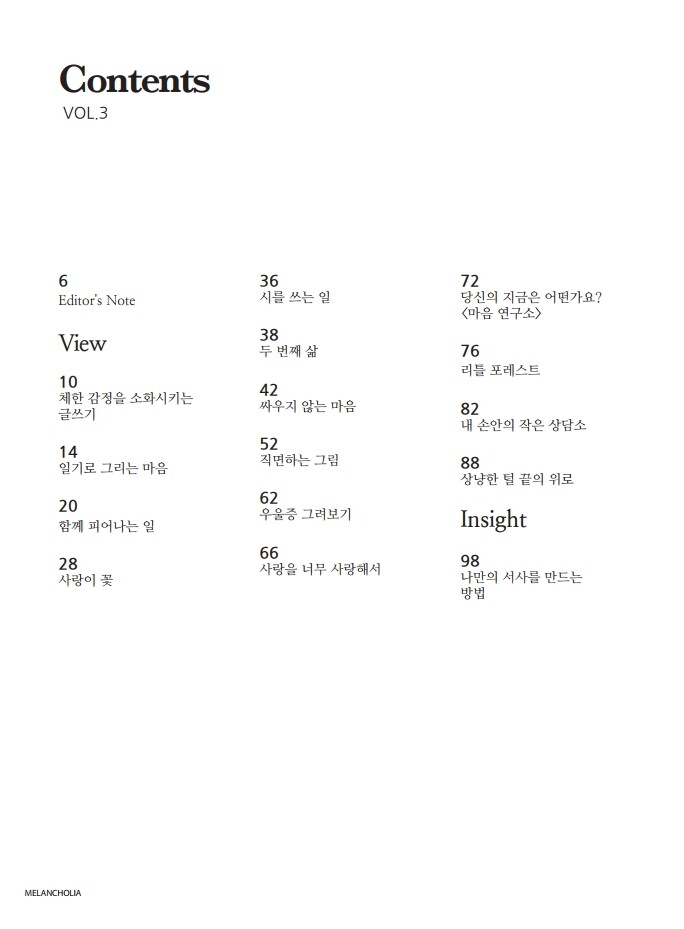 멜랑콜리아 3호 ‘치유하는 예술’에서는 치유하는 도구로서의 예술을 다룹니다. 일기, 시, 에세이, 미술, 영상 등을 통해 스스로의 감정과 마음을 확인하고 치유에 이용하고 있는 사람들을 만났습니다. 또한 문학, 미술, 음악, 무용, 사진, 연극을 통해 치료활동을 하고 있는 여섯 명의 예술치료사와의 인터뷰를 통해 전문 영역으로서의 예술치료에 대한 이야기를 들었습니다. 그 외에 282북스 강미선 대표, 99아트컴퍼니 장혜림 예술감독, 보스토크 박지수 편집장이 ‘치유하는 예술’에 대한 경험과 단상을 나눴습니다.