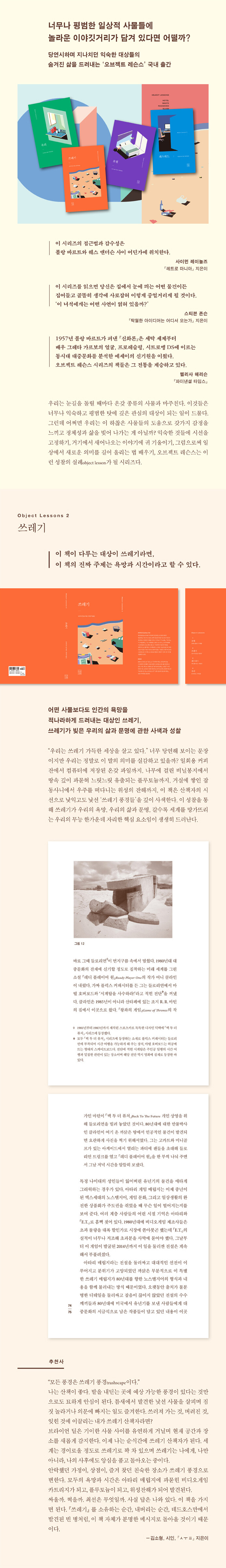 플레이타임의 ‘오브젝트 레슨스’ 2권. 쓰레기는 더 이상 사용되지 않는 사물, 욕망이 빠져 나간 사물이다. 쓰레기는 다 쓰고 버려진 것이므로 거기에는 그 어떤 애착도, 이야기도 남아 있지 않다고 느낄지도 모른다. 하지만 어쩌면 쓰레기야말로 궁극의 대상이 아닐까. 모든 사물은 시간에 의해 결국 쓰레기가 되며, 생산과 소비가 갈수록 가속화되는 이 시대에는 우리가 삶을 영위하는 공간과 시간이 훨씬 더 많이 쓰레기로 채워지고 있으니 말이다.
