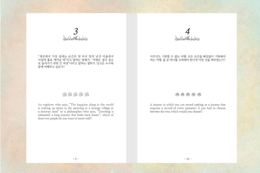 여행의 순간들은 일상에 없던 선택들의 연속이다. 평소에 생각해보지 않았던 수많은 선택지 앞에서 그때마다 누군가와 뜻을 맞추어 함께 길을 나아간다는 것은 결코 쉽지 않다. 여행 전에 서로의'여행 취향'을 알아보면 어떨까. 여행 전 함께 나누면 좋을 질문들 50개를 꼽아 놓았다. 어떤 질문부터 봐야 할 지 잘 모르겠다면 숫자의 잔디 위에 꽃잎이 피어오른 질문들을 먼저 살펴보면 된다.