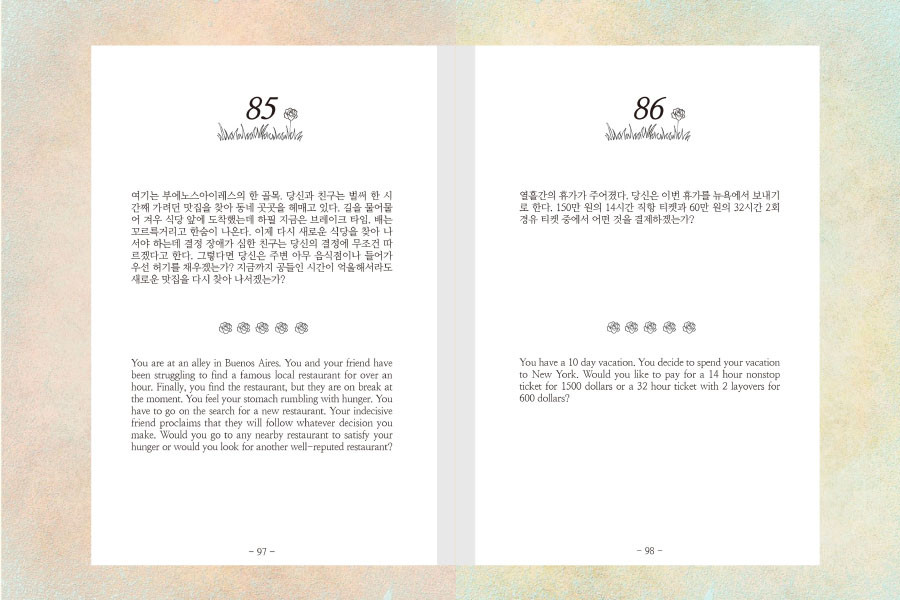 이 책에는 오직 질문들만 있다. 아무리 뒤져봐도 뒤에 정답지 같은 것은 없을 것이다. 스스로 ‘나는 어떤 질문에 끌리는가?' 또 '내게 전혀 중요하지 않은 질문은 무엇인가?'. 이렇게 질문 자체에집중해 보는 것, 몇 년 후에 다시 책을 펼쳤을 때 여전히 당신에게 유효한 질문인지 생각해 보는 것 또한 이 책의 묘미이다. 모든 질문에는 각각 다섯 개의 꽃, 별, 클로버 아이콘이 있다. 이것을 오간 척도로 사용해도 된다. 같은 질문을 두고 타인과 나의 중요도가 얼마나 다른지 알아보는 것도 재미있을 것이다.