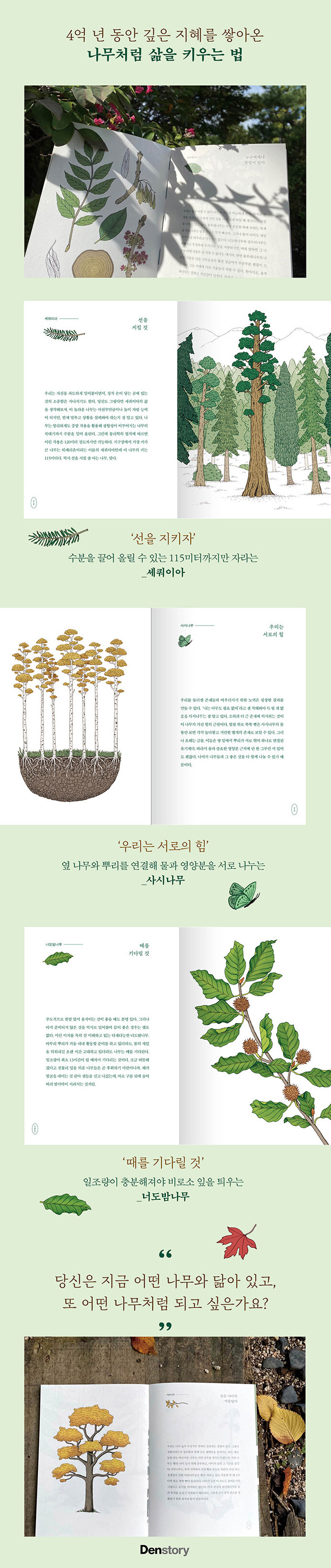 나무는 거의 4억 년 전부터 이 땅에 존재해왔다. 깊은 지혜를 쌓아오기에 충분히 오랜 세월을 지나오며 적응과 생존과 번영의 달인이 된 나무. 이 세상에 최소 6만 종의 나무가 존재할 수 있었던 이유는 수천 년에 걸쳐 나무들이 각자 자기가 뿌리내린 자리의 다양한 환경에 적응했기 때문이다.