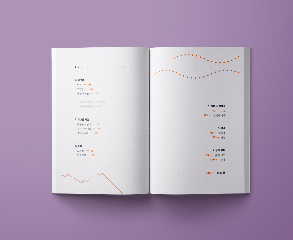 아주 옛날, 바다에 잠겨있던 시절을 지나온 산에선 가끔씩 조개가 발견되기도 합니다. 저는 이러한 부분이 엄마와 많이 닮았다고 생각했어요. 아주 오랫동안 말하지 않고 참아온 것들이 조금씩 수면으로 올라오고 있다고 느꼈기 때문입니다. 다양한 환경 속에서도 굳건히 이겨내 동그랗게 뭉쳐진 진주 속에는 얼마나 많은 그간의 이야기가 담겨 있을까 생각하며 파도와 산의 이미지를 겹쳐 표현하였습니다.
