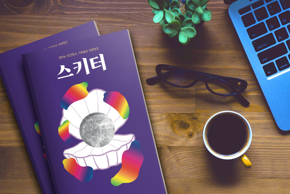 표지에는 조개 형상 주위로 홀로그램박이 입혀져 있고, 가운데에는 원형의 커팅으로 잘라져 있어 인쇄된 속표지가 비춰지고 있습니다.