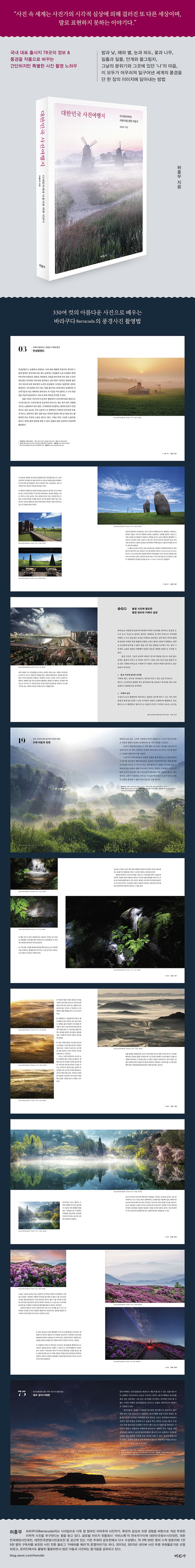 『대한민국 사진여행지: 디지털카메라 사용자를 위한 지침서』는 대한민국 대표 출사지를 중심으로 풍경을 작품으로 만드는 방법을 알려주는 풍경사진 촬영 가이드북이다. 일반 여행자와 아마추어 사진가가 선호하는 국내 사진 명소 78곳을 선별하여 가는 방법과 장소별 특징, 주요 포토 스폿, 각종 촬영 노하우 등을 알차게 담아냈다. 글로벌 이미지 유통회사 ‘셔터스톡’ 전속작가이자 3백 20만 명의 누적 방문자와 1만 5천 명의 구독자를 보유한 사진 전문 블로그 ‘카메라를 메라’의 운영자 바라쿠다(Barracuda)가 자신만의 촬영 노하우를 330여 컷의 아름다운 사진과 함께 소개한다.