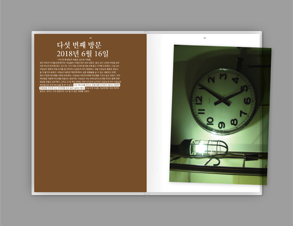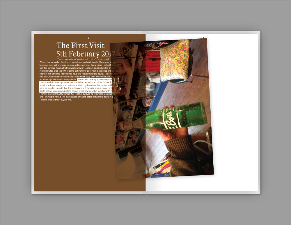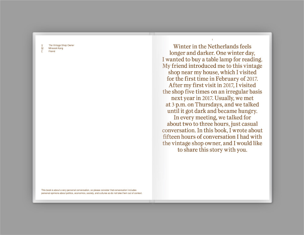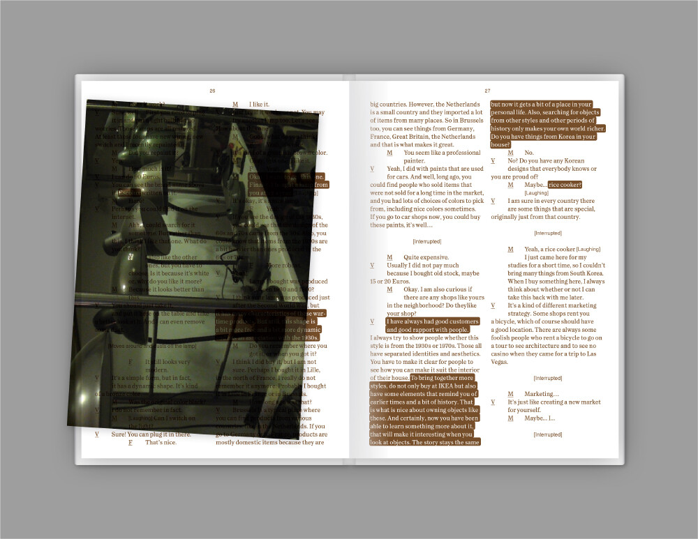 『The (In)Visible Vintage Shop』 is a transcription of a 15- hour conversation with the owner of a vintage shop that started back when she visited to buy a table lamp on a winter day. On her first visit, she heard that a popular Dutch soda product was involved in a rumour in the 1970s and went on strike. Afterwards, she visited several times for about a year, their conversation without a specific subject flowed in an unexpected direction, and gradually led to the thought of how to live alternatively in this era.