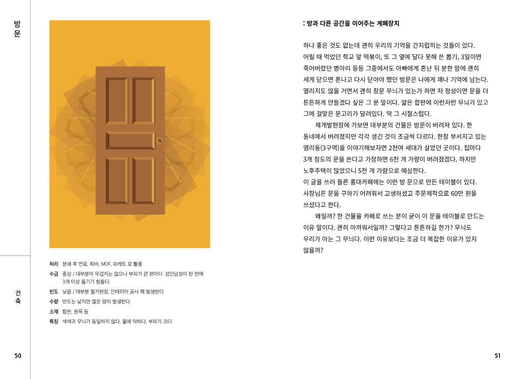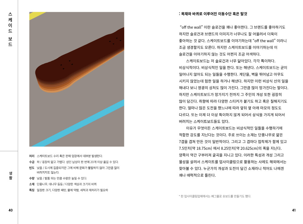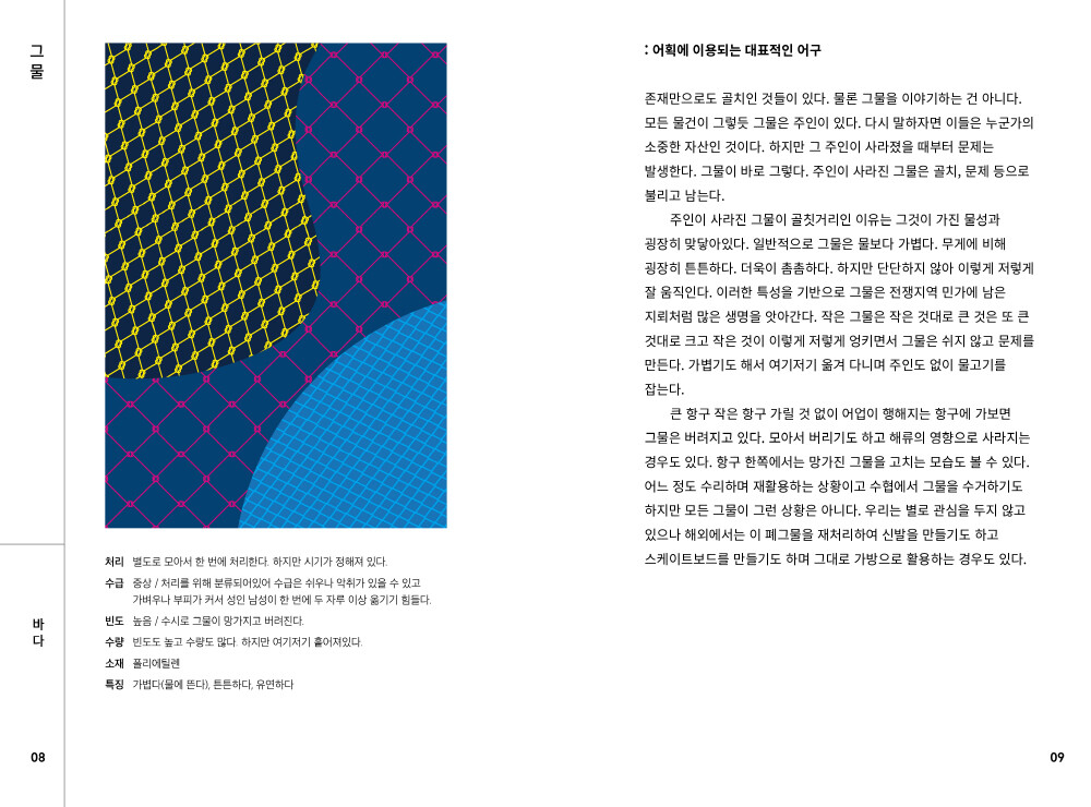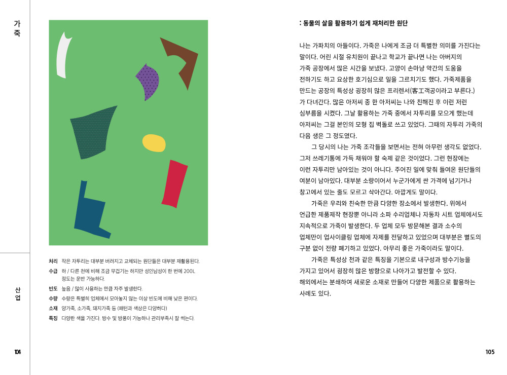 우리는 곳곳에서 터전을 이루면서 살아간다. 하지만 왜인지 우리는 숨 쉬는 것처럼 수많은 부산물을 만 들면서 살아간다. 어떤 부산물은 종전을 전달받지 못한 패잔병처럼 버려져도 자신의 임무를 계속한다. 또 어떤 부산물에는 한 가족의 역사가 담겨 있기도 하다. 아직 튼튼하거나 쓸 만한 매력을 가진 친구들도 많지만, 아무도 자세히 들여다 봐주지 않아서 부유해버리는 경우가 많다. 그렇게 부유하다가 어느 순간 모두가 고개를 돌리는 골칫거리 쓰래기로 변모한다. 이 책은 그런 사연을 가진, 아직 꽤 쓸모가 있는 소재를 모은 책이다.