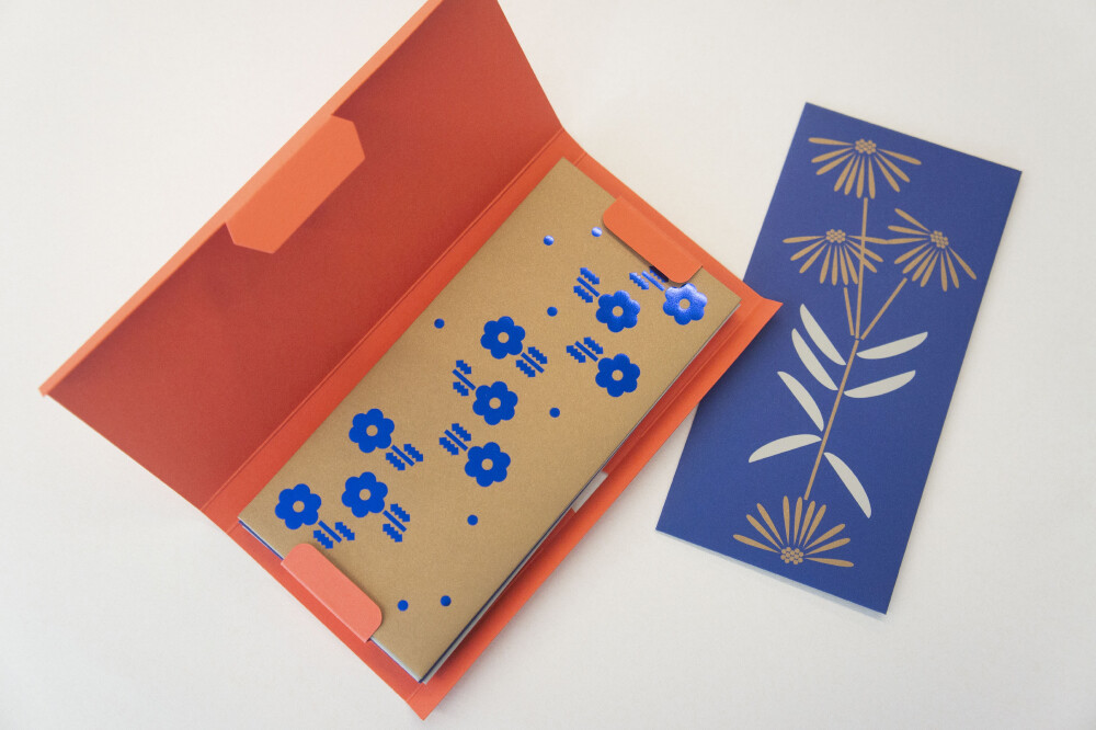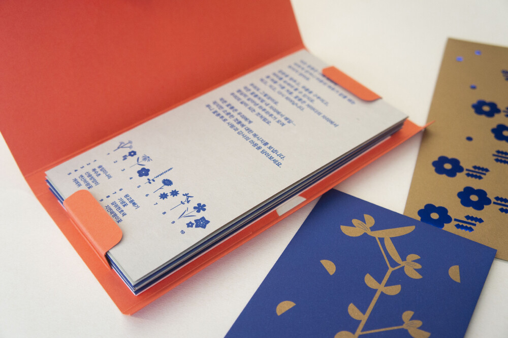 금색으로 인쇄해 차분하고 고급스럽지만, 기분 좋은 파란색이 포인트가 됩니다.