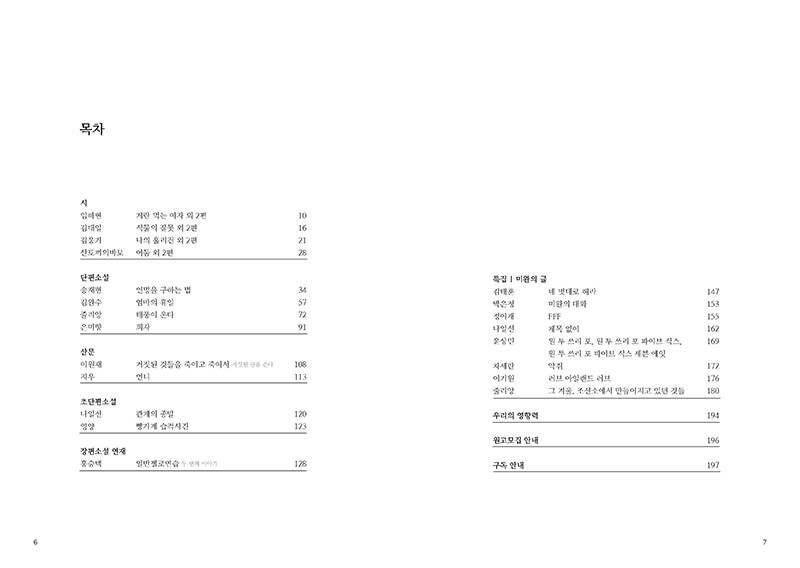 구성 : 시, 소설(초단편소설, 단편소설, 장르소설, 장편연재), 에세이, 특집(미완의 글)
