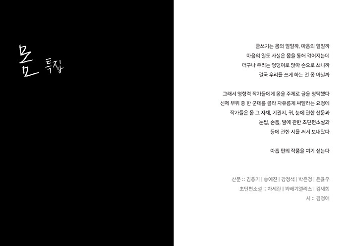 기존 영향력 작가들에게 몸을 주제로 청탁해 ‘몸 특집'라 이름 붙인, 9명의 작가가 보내준 9편의 개성있는 글,