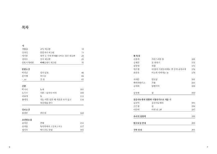 내용: 시, 소설(초단편소설, 단편소설, 장르소설), 에세이, 특집(몸-신체부위)