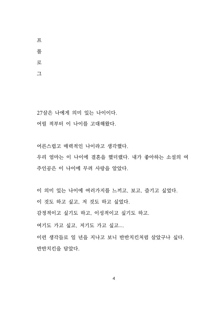 반반치킨은 후라이드 치킨과 양념치킨을 모두 먹고 싶을 때 시키는 치킨입니다. 제가 기대했던 스물일곱을 반반치킨처럼 산 것 같습니다. 1년간의 일기를 모아서 책으로 냈습니다.