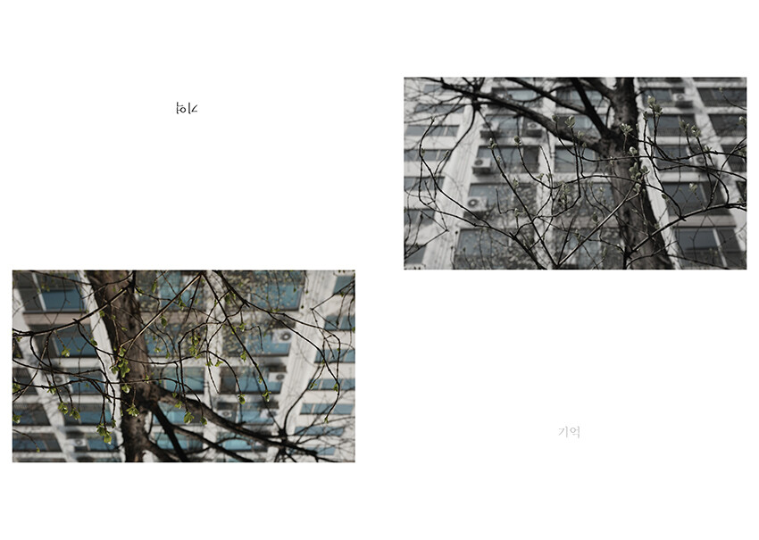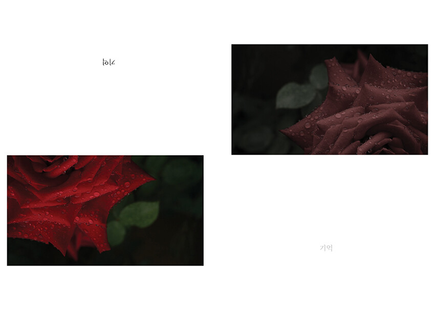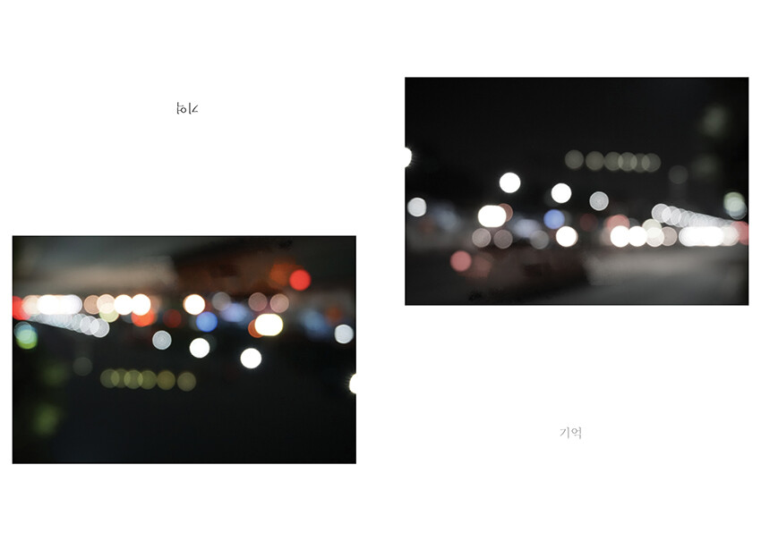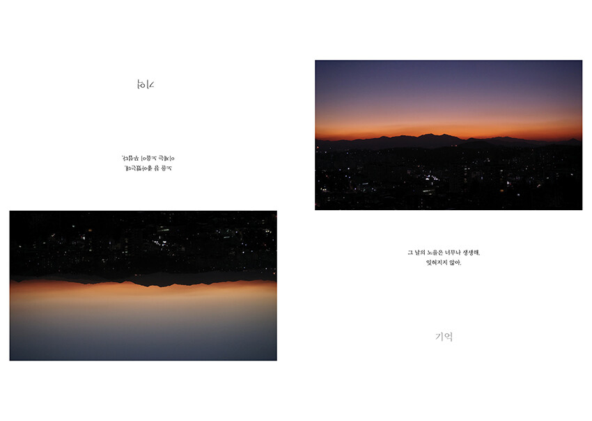 작가 개인의 기억인 사진으로 이루어진 독립출판물이 타인에게 얼마나, 어떻게 와닿을지에 대한 의문에서 시작한 작업으로서 과거에서 현재, 현재에서 과거로 동일한 기억(사진)을 채도의 변화로 진행한 사진집입니다.