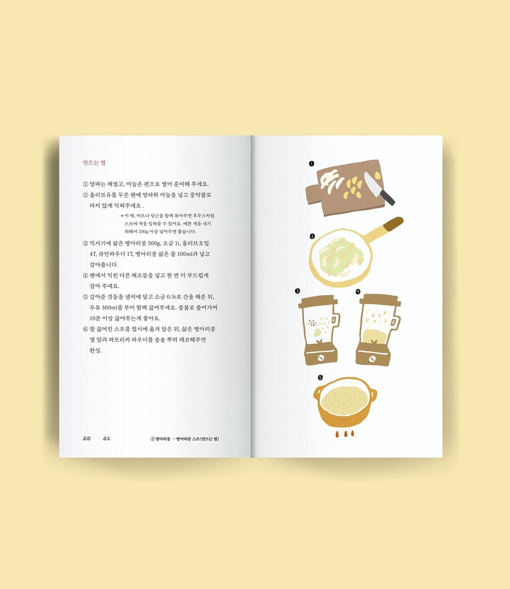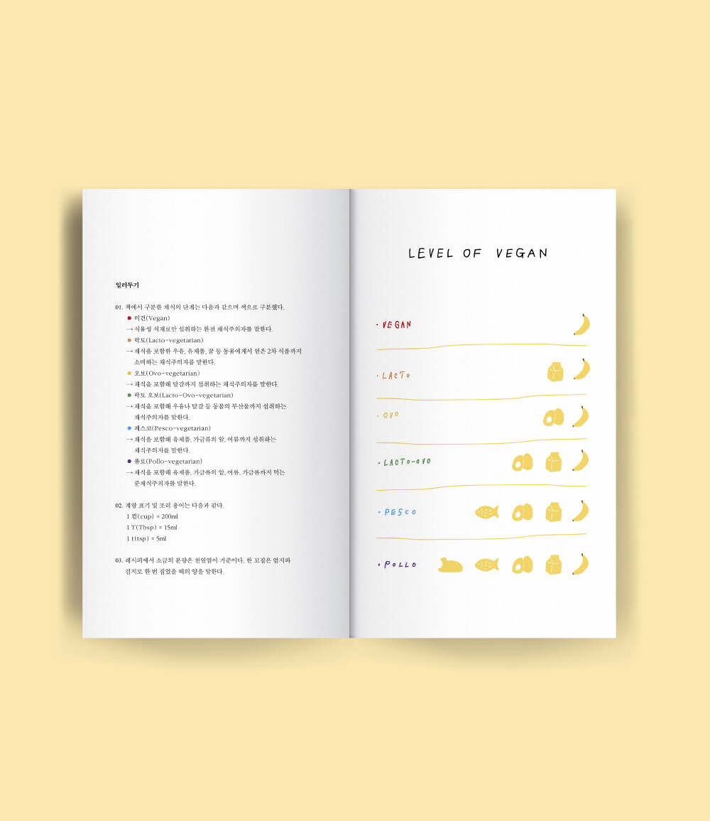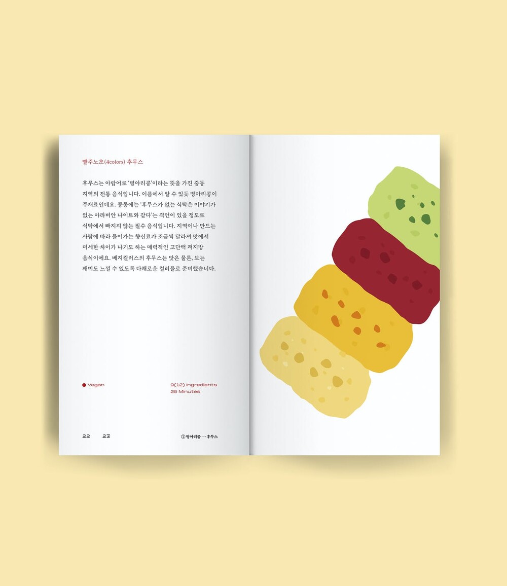 비건 일러스트 레시피북 <베지 컬러스>는 한 가지 컬러를 테마로 선정한 건강한 식재료들의 레시피와 활용팁을 담은 책입니다. 다양한 채소와 과일 등 식재료 본연의 색상에 주목하여 그에 가장 잘 어울리고, 맛있는 레시피를 소개해드립니다. 또한, 각 레시피별로 비건 단계가 표기되어 있는 비건 지향 레시피북이기도 합니다. 책에 담긴 레시피들을 따라서 요리하다 보면 멀고 어렵게만 느껴지던 비거니즘 실천을 조금 더 일상적이고 쉽게 실천할 수 있으실 거예요. 건강하고 맛있는 일상 속에서 <베지 컬러스>의 다채로운 비건 레시피를 활용해 보세요.