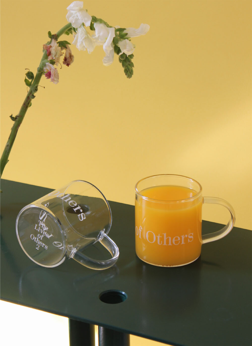 타인의 삶의 디자인 아이덴티티가 컵의 전면과 바닥면에 새겨진 190ml 용량의 손잡이가 있는 유리컵입니다.