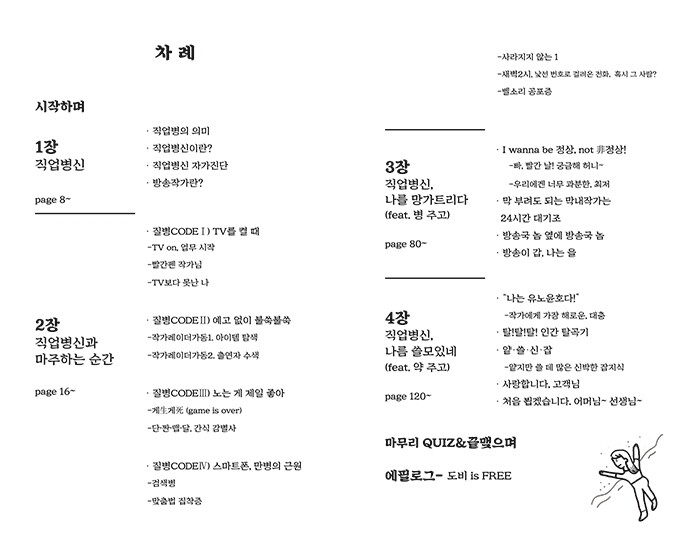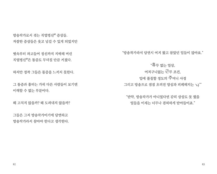 얘기를 나누다 보니 방송작가의 직업병을 종류 별로 나름 세세하게 분류할 수 있게 되었고 이에 대한 각각의 다양한 에피소드를 책에 담아낼 수 있게 되었습니다.