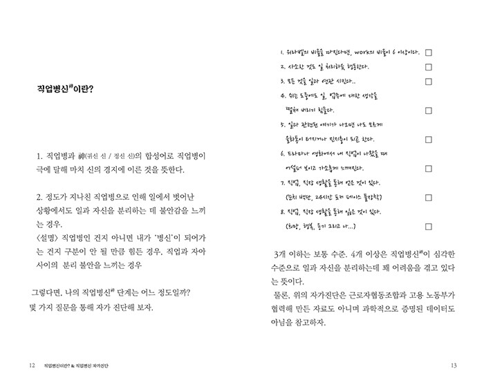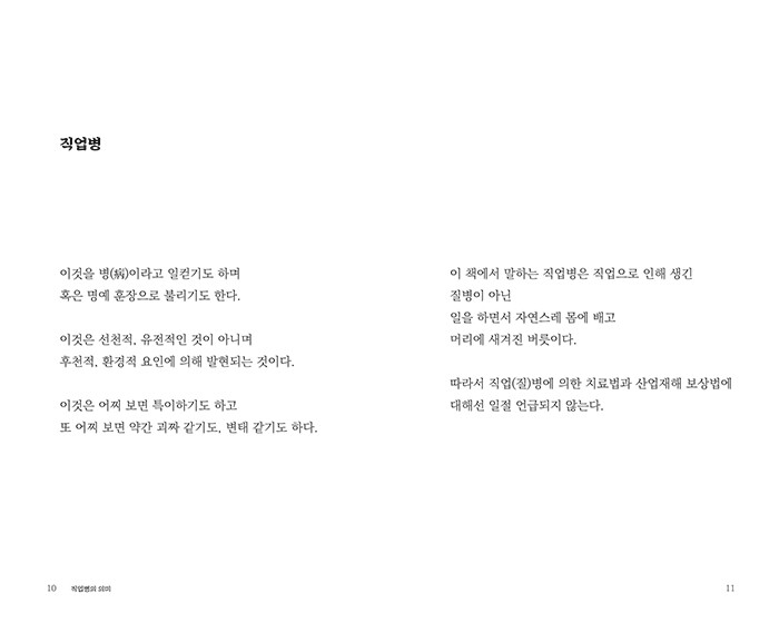 흔히 방송작가의 직업병이라고 하면 허리디스크, 손목터널증후군, 거북목증후군을 떠올리겠지만 <직업병신>은 위와 관련된 예처럼 신체에서 나타나는 질병이 아닌 일로 인해 몸에 밴 습관과 버릇에 대해 말하고자 합니다.