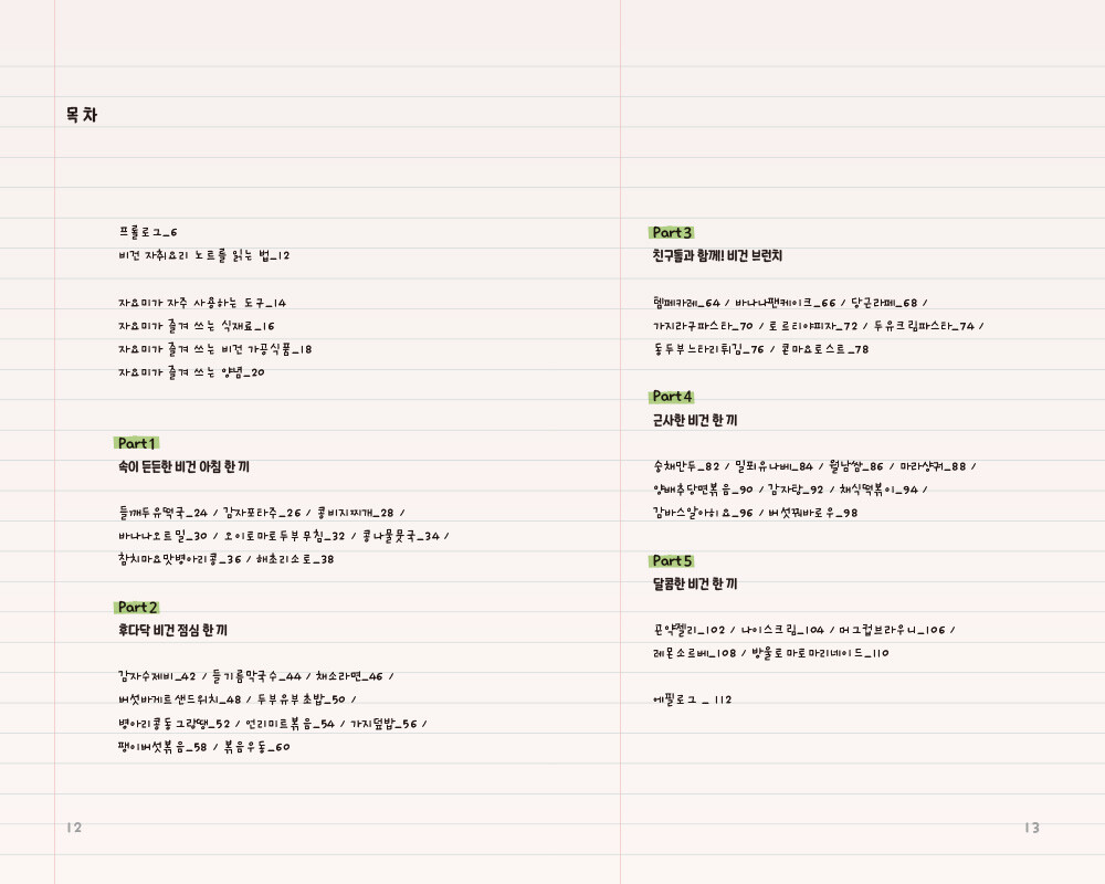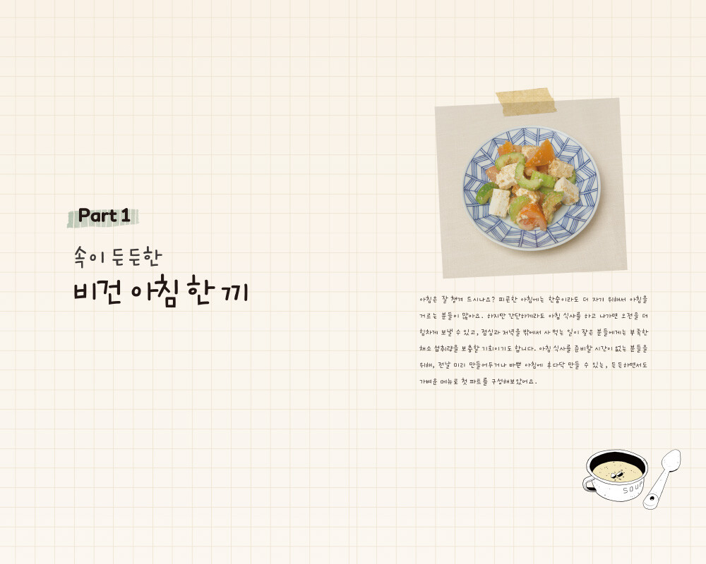 코로나로 인해 밀키트, 배달음식, 다양한 인스턴트 음식이 어마어마하게 발달하면서 집에서 음식을 해먹는다는 건 사실 쉽지 않은 일이 되어버렸죠. 하지만 저자는 이렇게 얘기합니다. 매일 하루 세 끼를 꼬박 해먹기보다 하루 한 끼, 아니면 이틀에 한 끼라도 나를 위한 밥상, 지구를 위한 밥상을 차려보자고 말이죠. 그래서 이 책에는 총 40가지 메뉴가 등장합니다. 후다닥 차릴 수 있는 아침 밥상부터 도시락으로 편하게 갖고 다닐 수 있는 점심, 가끔 친구들을 초대해 근사한 브런치를 대접할 수 있도록 했고 외식이 아니어도 충분히 만들 수 있는 마라샹궈, 밀푀유나베, 떡볶이 등 바깥 음식들을 건강한 비건식으로 즐기기 위한 아이디어가 가득합니다. 산뜻한 달달함을 채워줄 디저트 메뉴도 잊지 않았죠! 이 모든 것들이 다 비건 메뉴로요!
