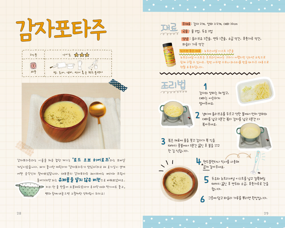 1. 요리를 만드는 데 걸리는 시간, 난이도, 인분, 필요한 도구를 한눈에 보기 쉽게 정리했어요.