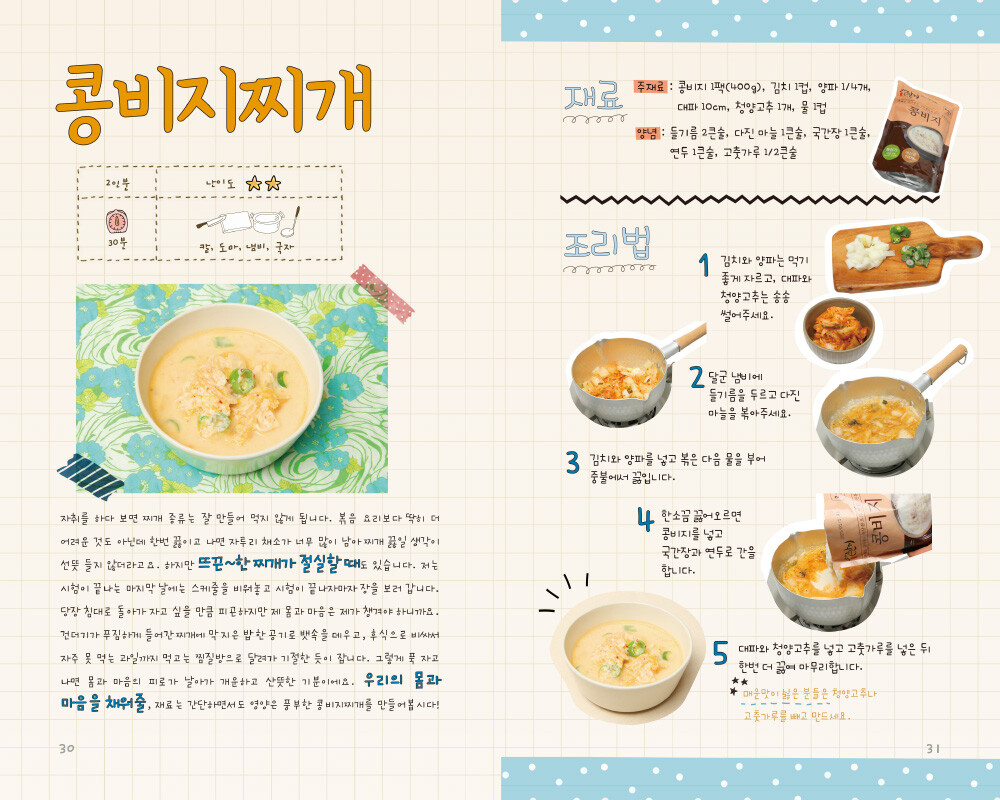 5. 메뉴 자체는 건강식이라 조리 방법 자체가 심플한데에 비해, 책 디자인은 발랄하고 통통 튀는 느낌으로 만들어 부엌에서 언제라도 꺼내 재미있고 신나게 요리를 할 수 있도록 했습니다.