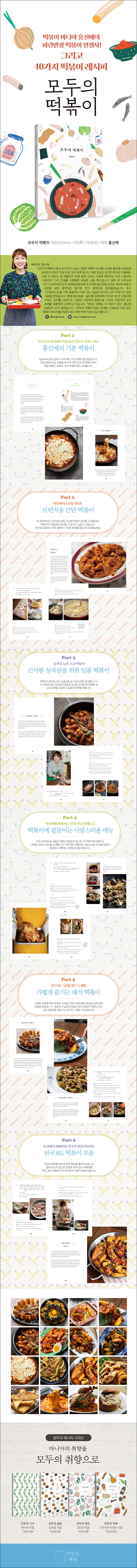 <모두의 떡볶이>는 독자 분들이 어린 시절 즐겨 먹던 학교 앞 떡볶이부터 저자 홍신애의 특별한 노하우가 담긴 이색 떡볶이와 간식이 아닌 일품요리로도 손색없는 푸짐한 떡볶이, 떡볶이에 곁들이면 가장 맛있는 사랑스러운 곁들임 메뉴를 비롯해 이 책의 하이라이트, 자타공인 떡볶이 마니아 홍신애 선생님이 전국을 돌며 맛본 떡볶이를 재해석한 전국 8도 떡볶이까지 가히 ‘대한민국 떡볶이 사전’이라 해도 손색이 없는 책입니다.