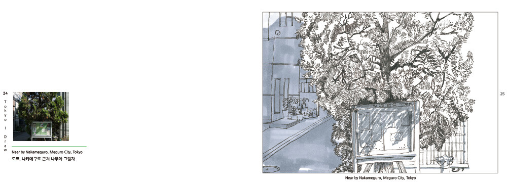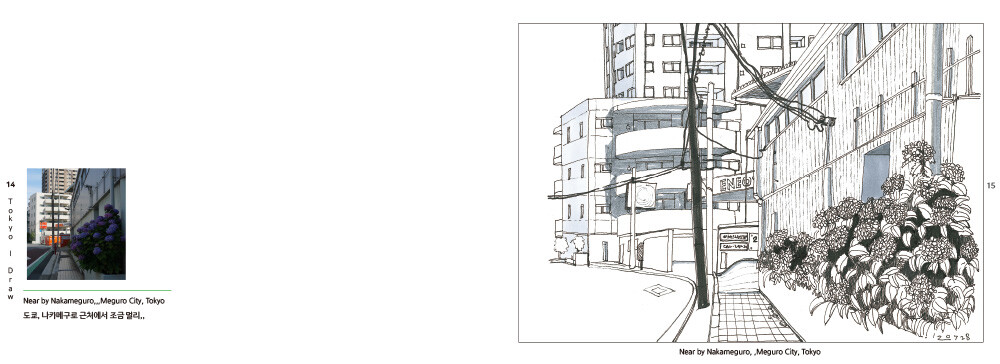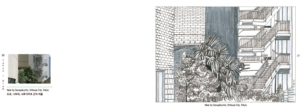 <Tokyo I Draw - 내가 그린 도쿄 풍경>은 ___ I Draw 시리즈의 첫 번째 편으로, 2019년 6월 여름에 다녀왔던 도쿄의 풍경들 중 15곳을 펜으로 그렸습니다. 왼쪽 페이지에는 컬러사진과 그 장소의 세부정보를 넣었고, 오른쪽 페이지에는 흑백 그림을 배치했습니다.
