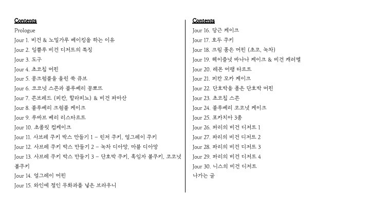 여행을 가서 비가 오면 대개 불평을 하기 마련입니다. 하지만 파리에서 비가 온다면 그 어느 때보다 아름답고 로맨틱한 파리를 만날 수 있습니다. 비가 오면 우울하고 불편하기만 하다는 편견을 비 오는 파리가 깨주듯 이 책과 함께하는 30일이 비건 & 노밀가루 디저트는 맛없고 투박하다는 편견을 버릴 수 있는 시간이 되셨으면 좋겠습니다. (본문 p. 177)
