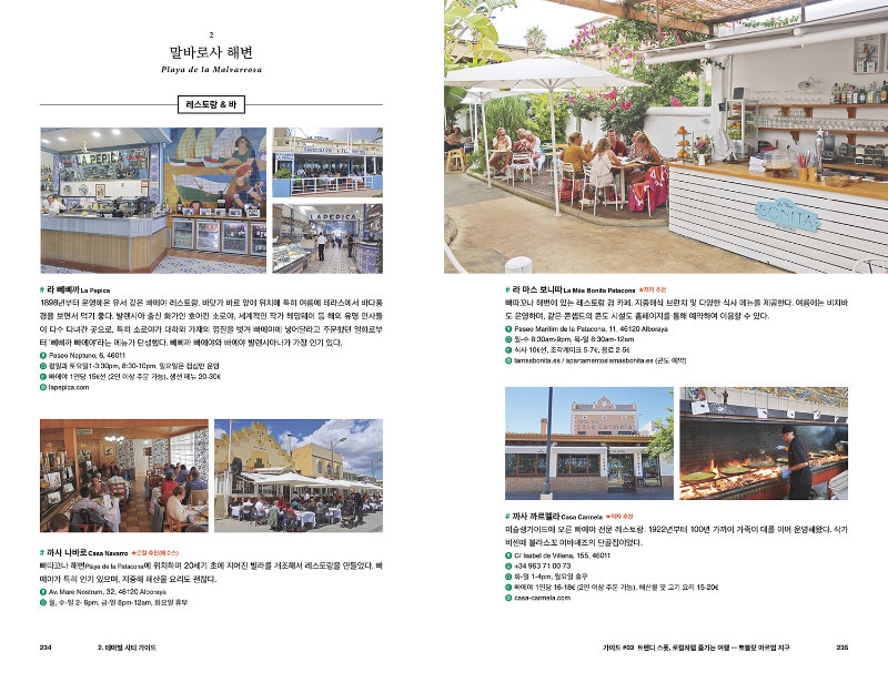 스페인의 보석 같은 도시 발렌시아를 국내에 처음으로 소개한다. 우연히 발렌시아를 만나고 사랑에 빠진 저자가 여러 번 체류하고 방문하면서 차곡차곡 모아온 역사와 전통, 축제, 명소, 로컬들의핫플레이스와 생활 정보를 차근차근 전한다. 세 가지 가이드 테마에 따라 발렌시아시를 돌아볼 수 있도록 세심하게 구성했고, 함께 방문하면 좋을 근교 도시 13곳의 정보와 가는 방법 역시 알차게 담았다. 특히 2018년 12월 기준으로 정리한 숙소, 레스토랑, 바, 카페, 각종 숍, 댄스학원과 영화관, 체인 등 200곳 이상의 최신 정보가 돋보인다. 발렌시아살이에 유용한 각종 생활 팁, 언어교환 모임, 간단한 스페인어 단어&회화 목록, 구역별 상세 지도와 지하철 및 버스 노선도, 세부 항목에 따른 QR코드도 함께 수록했다. 그때 그곳의 공기와 소리까지 담아낸 듯한 감각 적인 사진들, 현지의 오너와 셰프, 그라피티 예술가들과 나눈 생생한 인터뷰가 읽는 재미를 더해준다.