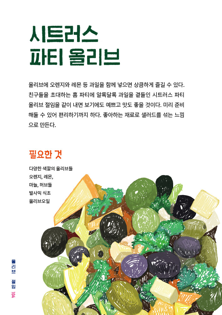 기원전의 그리스, 로마를 거쳐 오늘날까지 오랜 시간 인류와 함께해온 올리브의 이야기를 따라가다 보면, 한국인에게 필요한 올리브 정보와 요리 레시피를 통해 쉽고 간단하게 취향에 맞는 올리브 요리를 집에서도 즐길 수 있게 될 것입니다.