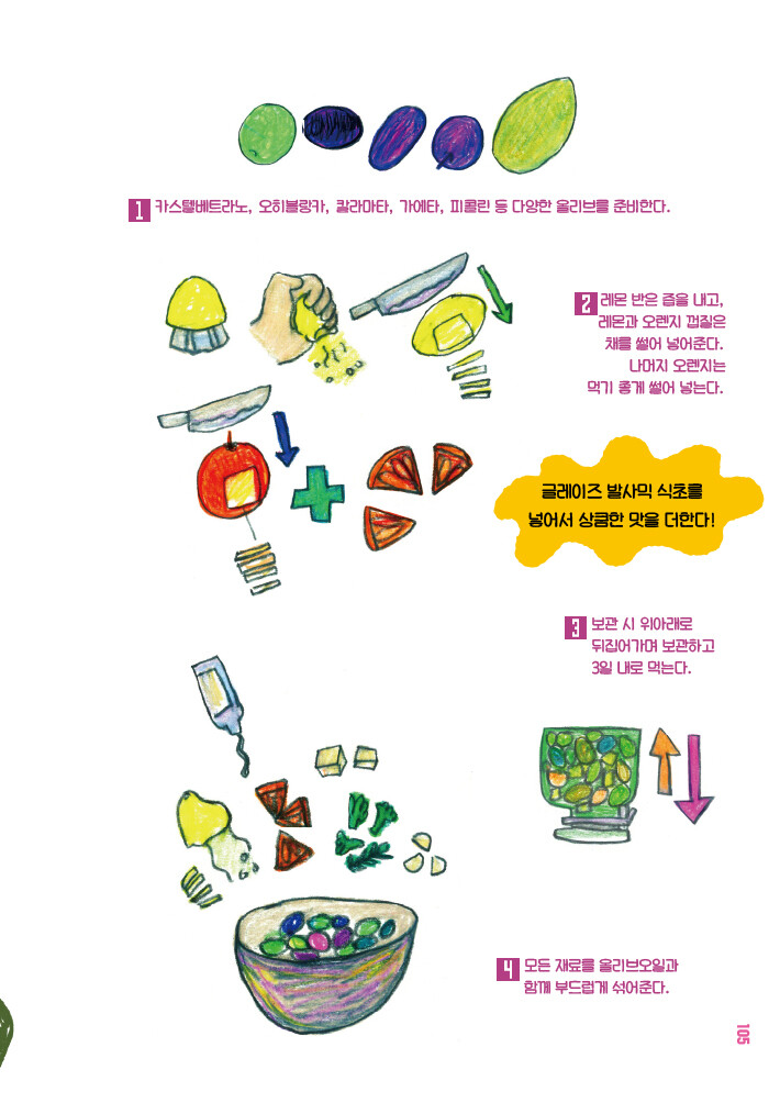 이번 ‘피자 위에 까만 거? 맞아요, 그 올리브!’ 2쇄에서는 싱그러움을 담은 새로운 표지와 함께 올리브를 좋아하는 긍정연 작가의 사랑이 담긴 일러스트와 다양한 요리 이미지들을 추가하였습니다.