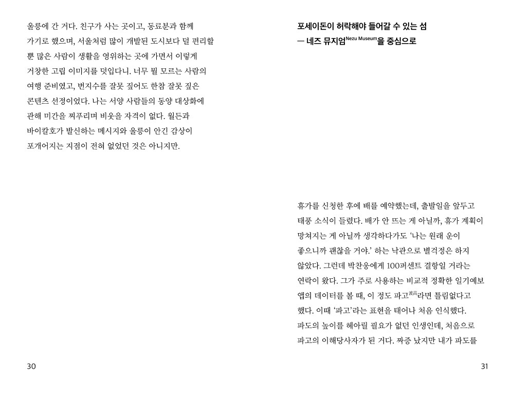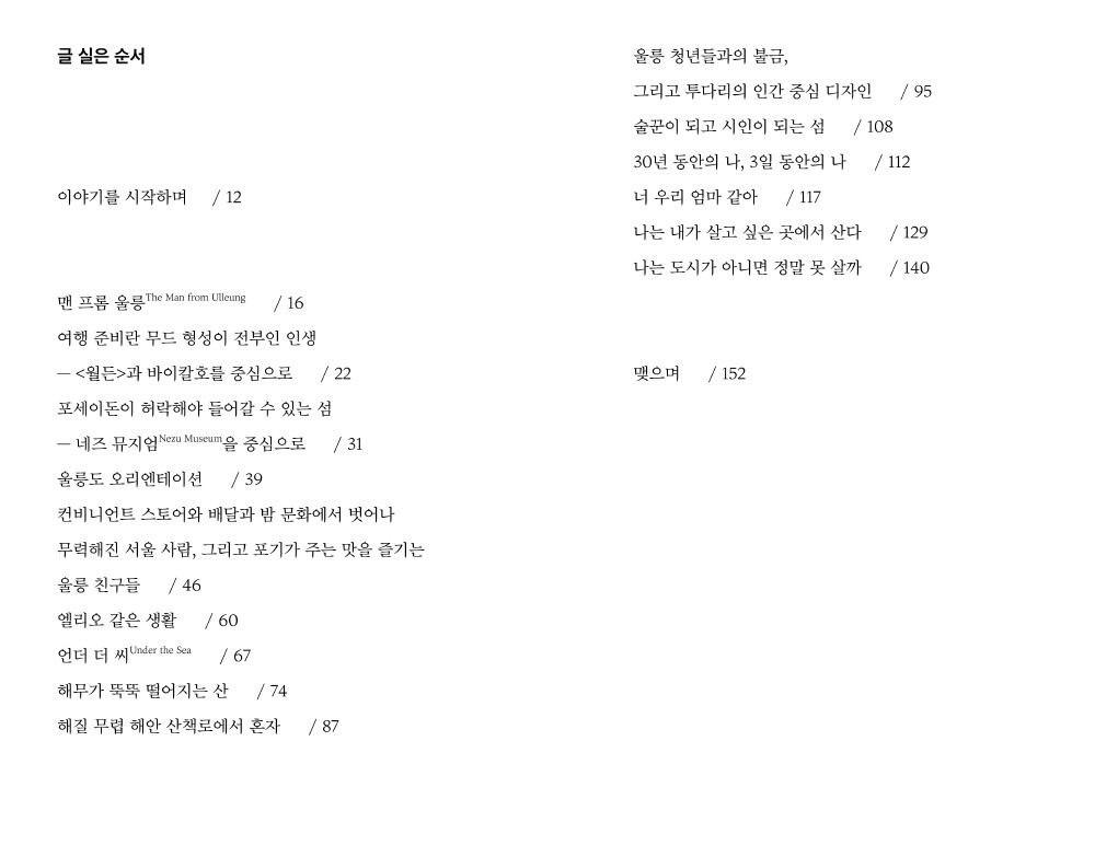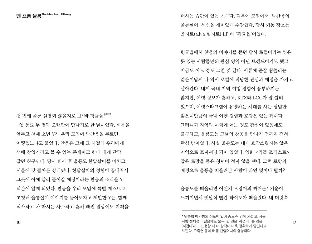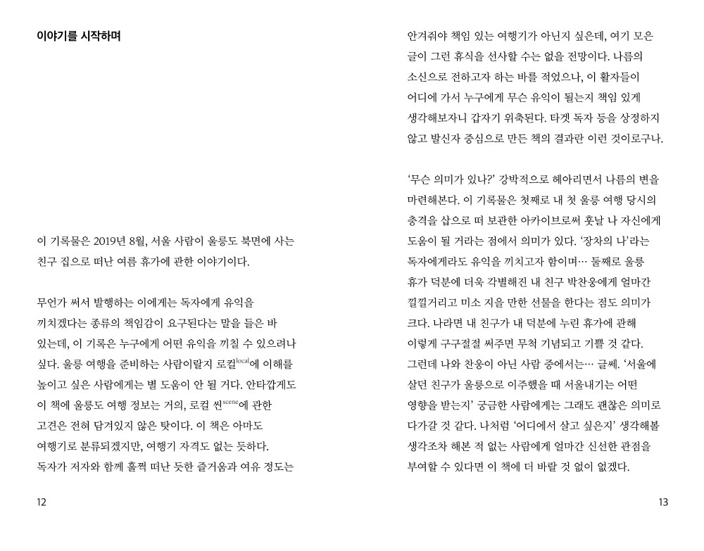 이 책은 2019년 8월, 서울 사람이 울릉도 북면에 사는 친구 집으로 떠난 여름 휴가에 관한 이야기입니다. 울릉 여행 정보가 담겨있다거나 글만으로도 여행하는 듯한 여유를 안겨주는 책은 아닙니다만, 서울에 살다가 울릉으로 이주한 청년은 어떤 모양으로 살고 있는지, 울릉으로 이주한 친구를 바라보는 서울내기의 심경이 어떠했는지를 살펴볼 수 있습니다. 저자는 친구 집에서 고작 일주일 남짓 시간을 보냈을 뿐임에도, 친구 집과 우리들의 자유, 타인이라는 가능세계와 경계선의 확장에 관해 진지하게 할 말이 생겼다고 합니다. 잘 모르는 섬, 처음 가보는 섬 울릉도여서 그랬으려나요.