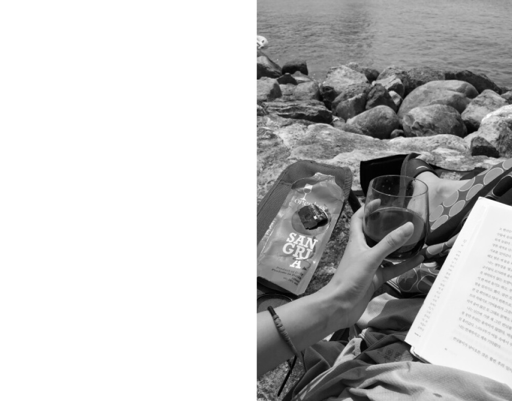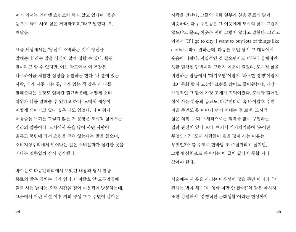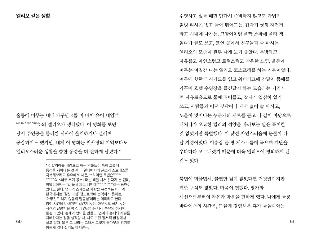 "울릉에 머무는 며칠간 나는 엘리오 코스프레를 하는 기분이었다. 여름에 핫한 래시가드를 입고 워터파크에 간달지 몸매를 가꾸어 호텔 수영장을 즐긴달지 하는 모습과는 거리가 먼 자유로움으로 물에 뛰어들고, 갑자기 열심히 일기 쓰고, 사람들과 어떤 부담이나 제약 없이 술 마시고, 노을이 멋지다는 누군가의 제보를 듣고 다 같이 마당으로 뛰쳐나가 오묘한 컬러의 석양을 바라보는 일은 특이한 것 없었지만 특별했다. 이 낯선 자연스러움에 눈물이 다 날 지경이었다. 이층집 끝 방 게스트룸에 묵으며 계단을 우다다다 오르내렸기 때문에 더욱 엘리오에 빙의하게 된 것도 있다."