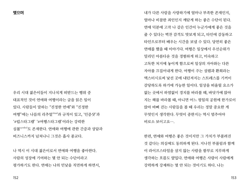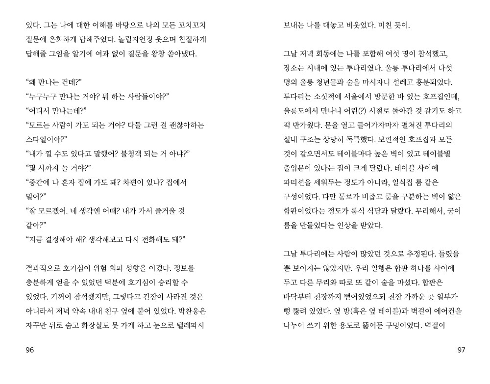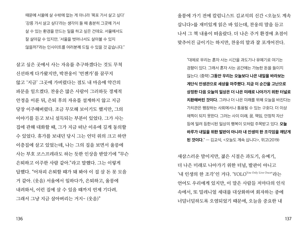 "서울에 살지 않는 청년들은 서울에는 사람이 너무 많다고 강력하게 넌더리쳤는데, 나도 그 점이 큰 문제라고 생각한다. 서울 사람도 서울에 사람이 많아서 힘들다. 사람이 많은 곳이기 때문에 내가 사랑하는 서울의 꼴을 갖출 수 있었겠지만, 사람이 너무 많아서, 정말 너무 많아서 살기 힘든 나의 서울. 사람이 많아서 누리게 된 서울의 혜택을, 사람이 많다는 이유로 포기하는 선택을 하는 날이 나에게도 올까? 그래서 이날의 결론은, 우리는 더 많이 만나야 한다는 거다."